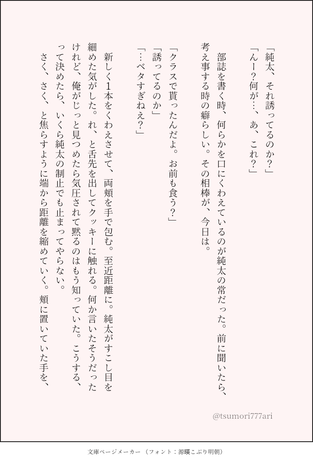 つもり☆quiet followDOODLE誰も付き合っていないソーホクシリーズ①ポッキーの日。 show all(+1 images) Tap to full screen (size:630x928).Repost is prohibited Let's send reactions! freqpopularsnackothersPayment processing Replies from the creator Follow creator you care about!☆quiet follow つもりDOODLE黒研。高校生。付き合ってない。 6 つもりDOODLE黒研。二人とも大学生。付き合ってる。⚠嘔吐!飲酒由来!少しでも拒否反応のある方は止めておきましょう。読んでからの苦情は困ります。🗝▶18↑? 6 つもりDOODLE黒研。大学1年×高校3年。付き合ってない。 4 つもりDOODLE黒研。猫舌。大人。 3 つもりDOODLE影日、若干黒研。Dom/Subユニバース。世話焼きの菅原さんがメインです。 5 つもりDOODLE黒研。気付いた瞬間。 3 recommended works カカオDOODLE #えっちな推しカプ#みんなのボタンメーカー※炭善※ヤッてるだけ※失神⚠︎R18!成人済ですか?(yes or no) 2 ハナモDOODLE3RTで性癖絵を描く#絵師強制ボタン#みんなのボタンメーカーhttps://btnmaker.me/b/a38c9fa0-07de-11ec-9878-055a350dba0d↑というお題が来たので今までなんとなく黙っていた部分を吐露した kmusaDOODLE13♡で泡だらけの推しカプをかく#すけべな気持ちの推しカプボタン#みんなのボタンメーカー♡ありがとうございます!泡風呂音セシちゃんになりました〜シャーペンで描いて色塗りはクリスタipadAirを使いこなす練習 takeyamaryuDONE🥃⚡⛓ #HerAlca3rtされたら推しをロリorショタにさせましょう#絵描きさんのボタン#みんなのボタンメーカー usaginoaramasaDONE⚠現パロ・肌色注意⚠今日の馬族[20231024]ボタンメーカーさんより白衣を着た推し…馬岱先生です。メガネは個人的な好みで白衣の下は…実は勢い余ってインナーを描き忘れてたのであとからソッと足したのナイショだよ!そんな裸白衣バージョンもおいておきますね… 2 Chuii翠DONE仗露⚠️露露⚠️CD/露Doodles are related to my 1💎2🖊️ fanfic "It's Josuke's Fault":https://archiveofourown.org/works/61400572 8 けいねDONE初描き今年もよろしくお願いします!! ハジキDOODLE尻尾で隠す🫣二枚目は相互さんリスペクトです〰︎(勝手に)パスはろくろの数字です。 2 本能覚醒PAST飛ばないで天使ユジの冬ボ前提で書いているスノーエンジェル作るタん、可愛いに決まってんな……と思いながら書いたけどサ終決定後おセンチ脳(とデフォの性癖)のせいで寂しい話になっちゃった2、3枚目は新書メーカーで出力したやつ! 3