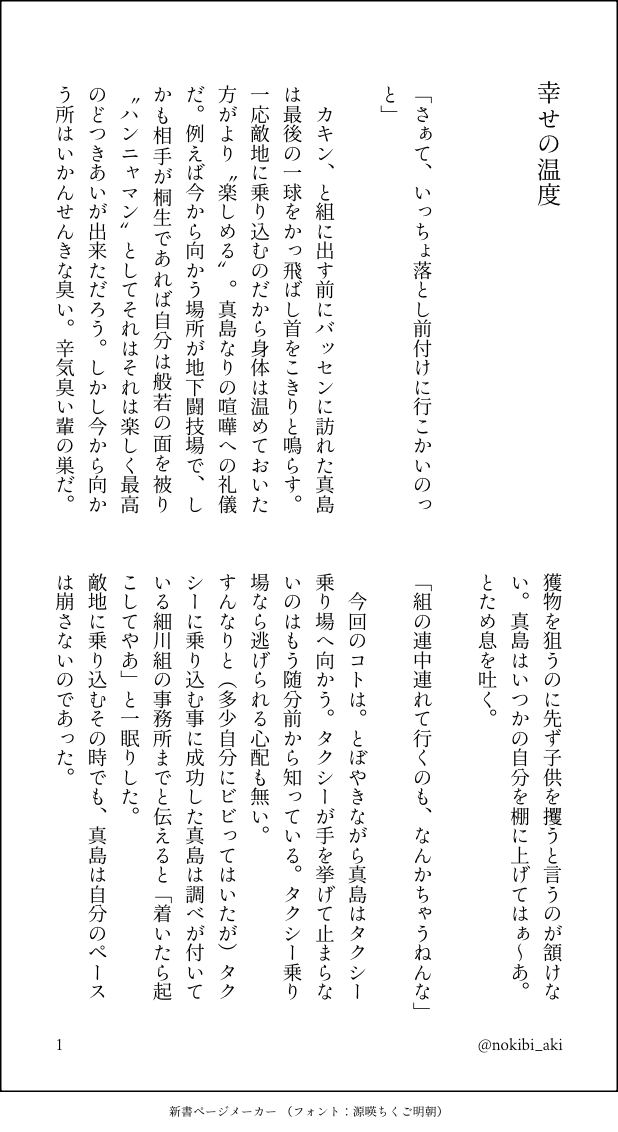 nokibi_aki☆quiet followDONE愛べき息子たち。 ##幸せの温度 show all(+3 images) Tap to full screen (size:618x1132).Repost is prohibited Let's send reactions! freqpopularsnackothersPayment processing Replies from the creator Follow creator you care about!☆quiet follow nokibi_akiDONE朝、みんなが学校に行って一息と思ったら、予期せぬ訪問者で nokibi_akiDONE明後日の前の日。 4 nokibi_akiDONE⚠️いまらししのす! nokibi_akiDONE続き🔞🔞🔞🔞 nokibi_akiDONE髭を剃る時 4 nokibi_akiDONE続きです!えちちちちち注意 recommended works nokibi_akiPROGRESSペン入れ終わり!仕上げだ〜!!! 3 nokibi_akiDONE心の準備 身体の準備 5 32mzkrDONE6後イメージ同棲ifエピローグの後に社会の掃き溜めのような極道の世界にあっても、大切な人をどれだけ失い心が折れそうになっても、真っ直ぐ前を見詰める瞳は濁らない。 そうしてそれを持つ彼自身も嘘を吐けず曲がったことが許せぬ性格をしていた。 彼を慕う者はそこに惹かれたし、振り返れば自分もそうだった。 生き辛そうやな、とは思う。 自分のように、いやそこまでいかなくても、上手く自分の心に折り合いを付けて流されながら世の中を渡れば、そして総て背負おうとしなければ、もっとふつうのしあわせというものが手に入れられただろうに。 隣に眠る男を眺めながら思う。 睫毛が震えゆっくり瞼が開かれる。 黒眼は潤んでいて甘そうだ。思わず舐め取りたくなるが、頬に触れるだけに留めた。 1169 nokibi_akiDONE卵うどんとふたつの理由。 4 nokibi_akiDONEあだ名は、狂犬だった。 4 シエルDONE「眠る男」 3 シエルDONE「片片想いのLoveRing」1 5 sugoku_zasshokuDOODLE 3 nokibi_akiDONE漏れてしまう声情けないほど、震えてしまう。 4