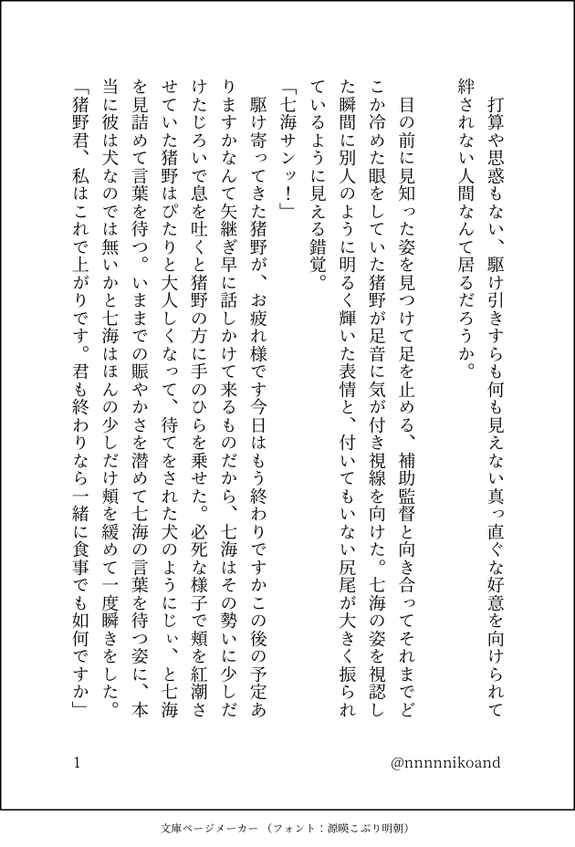 nnnnnikoand☆quiet followDOODLEXに画像でのせいてるやつ(20231121)猪七はいのくんの押し切り勝ちみたいなところあると思っているけど抜け出せなくなるのは七だしこの後恋人ってポジション手にいれたら絶対に逃がさないって思っていそうな獣感が猪にはある… show all(+1 images) Tap to full screen (size:630x928).Repost is prohibited Let's send reactions! freqpopularsnackothersPayment processing Replies from the creator Follow creator you care about!☆quiet follow nnnnnikoandDOODLE見れなかった星と猪七金木犀の花には誘惑って意味もあるらしい 4 nnnnnikoandMOURNINGふせったーに一瞬だけ載せていたもの。猪七のことだけど、事変後に触れているので閲覧ご注意ください。30代後半になったいのくんが生まれ変わったななみさん(16)と出会ってちゃんとふたりでしあわせになってほしいって言う妄想をネタ吐きベースで書きなぐったもの。小説ではない。自己責任でお願いします🙇🏻♀️y/n 1499 nnnnnikoandDOODLEXに画像であげているやつ。ずっと穏やかで優しい時間の中で一緒に居て欲しい 3 nnnnnikoandDOODLEXに画像でのせいてるやつ(20231121)猪七はいのくんの押し切り勝ちみたいなところあると思っているけど抜け出せなくなるのは七だしこの後恋人ってポジション手にいれたら絶対に逃がさないって思っていそうな獣感が猪にはある… 2 nnnnnikoandDOODLEXに画像であげてるやつ(20231116)はじめてキスをした次の日にもう一度したいと思ってもそれを口に出すのがはばかられて何度口篭る猪と自分から強請ることは出来なくて猪からしてくれるのを待っている七の攻防とやっと口に出すことが出来た「今日もしていい?」に対して「…聞かないでください」て目を閉じる七の猪七 nnnnnikoandREHABILIいのくんによろこんでほしい気持ちでえっちなお誘いをするななみさんのおはなしです。本当はちらついてるだろう下着から覗くおっぱいもちゃんといのくんに触らせてあげたかったんだけど書ききれなかったのでいつかリベンジさせてあげたいと思っています。やることをやっているところまでかきました。18歳以上ですか? 6003 recommended works ななおDONE【猪七】片想い学生猪ネタ大好きワンドロに遅刻参加しようと思って書いたんですが、お題とズレ過ぎてる気がしたので結局タグ無し 3 白焦げDOODLEフォロワーさんからのリクエストで『初心な2人』で『滲みパンツ』な猪七。完成してから猪野くんほぼ顔が映ってない事に気付いた…ごめんね猪野くん…我慢の限界突破した猪野くんなので待てはできません。 penta_1717DONEろくさんに頂いたリクで、猪くんがナンパされているところを発見した七さんです☺️ penta_1717DONEリク頂きました、いのピスまんがの続きになります☺️鱒さんリクありがとうございました♪💕 4 penta_1717MOURNING猪七です。昨日のアニに関連するので閲覧注意ですいのくんあのまま会えずに…って悲しくて…😭 Ip5Mf2nDOODLE術師家系と非術師の家系とじゃ格差があったのかな?という妄想明朗な猪野くんが育つので猪野家は明るくあって欲しいけど…!ひとつの解釈! 4 Ip5Mf2nDOODLE呪霊のせいで見た目が若いときになっちゃったななみの猪七の話はいつか描く、というメモ HATODONE付き合いたてほやほやの猪七(えちちはまだ) penta_1717DONEいのぴすまんがの続きです 5