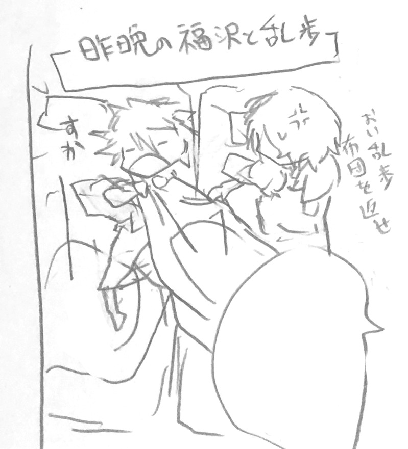 今描いてる長編漫画のボツコマ。私の中で今日探偵社設立と同時に乱歩さんが社会人になった=一人暮らしになったという設定が追加されたのでこのコマはボツになりました。でもかわいいね!