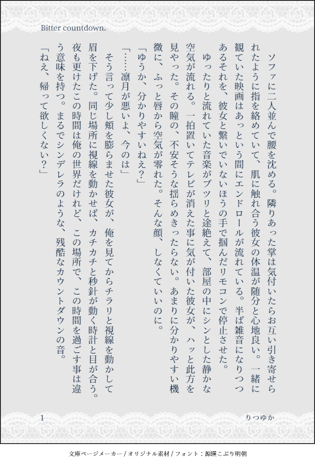 ちまちゃん☆quiet followDONEBitter countdown. #りつゆか show all(+4 images) Tap to full screen (size:630x928).Repost is prohibited Let's send reactions! freqpopularsnackothersPayment processing Replies from the creator Follow creator you care about!☆quiet follow ちまちゃんDONEOver The SUMMER! 11 ちまちゃんDONEクリームソーダに愛を乗せて 6 ちまちゃんINFOこの愛ごと抱きしめて。🖋@_y__175 5 ちまちゃんDONEオムライスとメッセージ 7 ちまちゃんDONE必殺技「我儘」の使い方講座 8 ちまちゃんDONE幸福論 8 related works ちまちゃんDONE幸福論 8 ちまちゃんDONEGood night sweetie. 9 ちまちゃんDONE口移しのチョコレート 8 king_77hDONE雪解けは春の陽だまりとともに(1/15) 6 ちまちゃんDONEBitter countdown. 5 ちまちゃんDONEYou can't be princess. But, 7 ちまちゃんDONELike a ring?Word pallet🎨支配/指/紅茶/消えて無くなる 9 ちまちゃんDONE雪解けは春の陽だまりとともに 6 recommended works ちまちゃんDOODLE結婚記念日にももちゃんへの愛を再確認するカケルくんのカケもも🦊 3 ちまちゃんDOODLEおふろあがりのヒロちま🧸 6 ちまちゃんDOODLEHappy Halloweenなシンねね👻 7 ちまちゃんDONEおかえりなさい、ねねさん なシンねね🐶 6 ちまちゃんDONEアイスクリームと初恋🍨なくま学シンねね🐶 7 ちまちゃんDONEGood Morning My PRISM. 7 ちまちゃんDONE🐶🌀💭 7 ちまちゃんDONE生徒Cの幼馴染観察日記 7 ちまちゃんDONESlowly slowly. 7