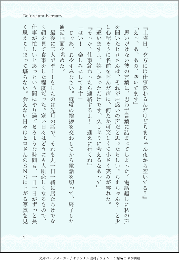 ちまちゃん☆quiet followDONEBefore anniversary. #ヒロちま hirochima show all(+9 images) Tap to full screen (size:630x928).Repost is prohibited Let's send reactions! freqpopularsnackothersPayment processing Replies from the creator Follow creator you care about!☆quiet follow ちまちゃんDONEOver The SUMMER! 11 ちまちゃんDONEクリームソーダに愛を乗せて 6 ちまちゃんINFOこの愛ごと抱きしめて。🖋@_y__175 5 ちまちゃんDONEオムライスとメッセージ 7 ちまちゃんDONE必殺技「我儘」の使い方講座 8 ちまちゃんDONE幸福論 8 related works ちまちゃんDOODLEちまねねデートがダブルデートになるまでのヒロちま🧸#ヒロちま 5 ちまちゃんINFO𝓗𝓮𝓻𝓸𝓲𝓬 𝓒𝓲𝓷𝓭𝓮𝓻𝓮𝓵𝓵𝓪.Hiro Hayami × Chima MinamiOfficial fan book vol.12021.06.10cover:Nene Yukishiro.Word:Chima Minami. 48 ちまちゃんDOODLEおふろあがりのヒロちま🧸 6 ちまちゃんDONE生徒Cの幼馴染観察日記 7 ちまちゃんDONESlowly slowly. 7 ちまちゃんDONESugery bath room🛁 8 ちまちゃんINFOCHocolate HoliCpresented by HIRO&CHIMAphoto by NENE YUKISHIRO 12 ちまちゃんDONEBefore anniversary. 10 ちまちゃんDONEFound my star. 7 recommended works ちまちゃんDOODLEちまねねデートがダブルデートになるまでのシンねね🐶 4 ちまちゃんDOODLEおふろあがりのヒロちま🧸 6 ちまちゃんDOODLE一人暮らしを始めたねねの学生時代シンねね🐰🍒 7 ちまちゃんDOODLEHappy Halloweenなシンねね👻 7 ちまちゃんDONEアイスクリームと初恋🍨なくま学シンねね🐶 7 ちまちゃんDONEDAISUKI goes on! 6 ちまちゃんDONEGood Morning My PRISM. 7 ちまちゃんDONE🐶🌀💭 7 ちまちゃんDONE生徒Cの幼馴染観察日記 7