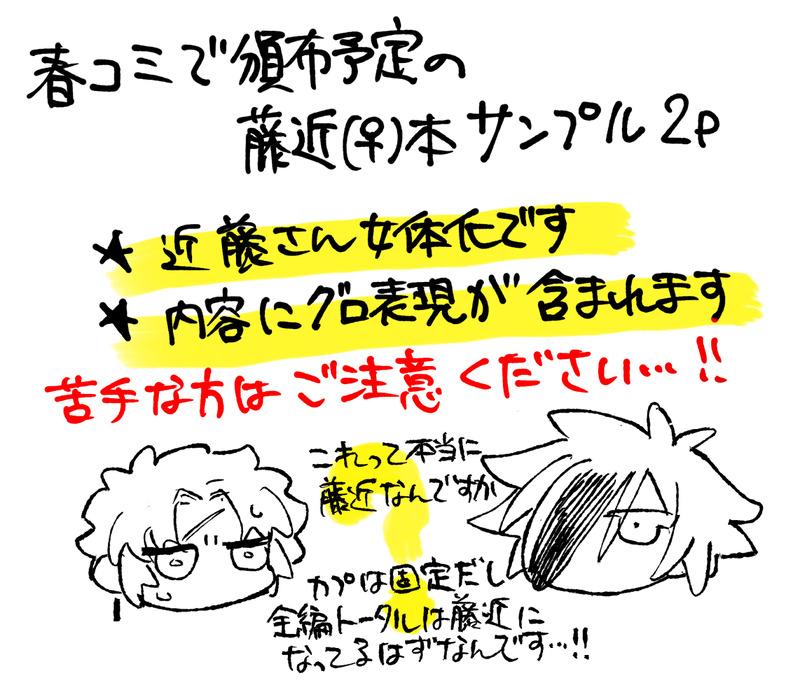 描けたら描く☆こそフォロ作業進捗春コミで出す藤近(♀)本の進捗兼サンプル2p前書きにもありますがグロ表現ありますので苦手な方は注意サンプルのような小話を数話詰めた本になる予定です。真面目8割くらいの内容になってしまって、おかしいな…… すべて表示(+2枚) タップで全画面(原寸:1370x1194)無断転載禁止 リアクションをたくさん送って応援しよう! よく使う人気おやつその他支払処理中 作者からのリプライ 気になる人をどんどんフォローしよう!☆こそフォロ 描けたら描く作業進捗春コミで出す藤近(♀)本の進捗兼サンプル2p前書きにもありますがグロ表現ありますので苦手な方は注意サンプルのような小話を数話詰めた本になる予定です。真面目8割くらいの内容になってしまって、おかしいな…… 3 描けたら描くらくがき※攻めの女装もあるので注意※また東方しょうもな募集だったのにわざわざマロを送ってくださった方、ありがとう…思えば東方に馴染みがあるのってインターネット老人会すぎ!?でも原稿に良いんだこれが…Bad Apple!!のアレンジ曲も好きだけど原曲がピコピコゲームサウンドで想像以上に可愛くて良かった♡桜は幽雅に〜ですかね?丁度描いていたのでつまり…近藤さんということ… 3 描けたら描くらくがき東方シリーズ内でのイメソン教えてください!原稿がんばります!https://marshmallow-qa.com/6nqo3dax2qf0baq?t=CX0BtV&utm_medium=url_text&utm_source=promotion 描けたら描くらくがき女体化近藤さんと平近前半健全寄り、後半露出気味とよく分からないものを色々。なんでも許せる人向け。パスワードは18歳以上ですか?の解答 26 描けたら描くらくがき普通の近藤さんと藤近枚数少なめでほぼ裸。普通の近藤さんも描けるらしい!パスワードは18歳以上ですか?の解答 4 描けたら描くらくがき女体化近藤さんと平近(一枚普通の近藤さん)正気だったり正気じゃなかったりちょっと肌露出あったりパスワードは18歳以上ですか?の解答 7 おすすめ作品 十十人匕らくがき calmdestorm2できたロマサガ2R耳元で鳴らしてやろうか?と脅してくるクジンシーやめて kikmuraらくがきMaybe dat last one is a bit much 2 壱村/灰作業進捗ブートヒル実装記念動画の進捗スクショ 5 sugame_trpgらくがき快刀乱魔げんみ❌ HO2秘匿持ち⭕️自ほにらくがき raku_luckらくがき灰レムレム 嘘つき renju_2525らくがき♢渡会雲雀さん新衣装感謝のらくがきんちょ ハム猫小判できたやっと3枚完成した〜✌️☺️✌️あらすたさん達で❤️マーク3種!きゃわいいが溢れているっ!!🫶❤️一部腕が死んでるけど、目を瞑ってください……😔生前さんは、衣装とか知らないので適当です。光は左右から来てるんだよ……。(小声) 3 せがわできたQカズです。気圧と朝に弱いって捏造しました、 510