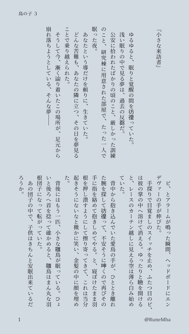 Rune☆quiet followDONE炎ホ 鳥の子 3(1/7)「小さな来訪者」・炎ホ結婚してる。(婚姻届提出済)・年齢操作あり(炎52、ホ30)(その割に年食った感がない)・設定捏造過多やっと新規入りましたうぇーぼ!https://wavebox.me/wave/eyomzjbrmtdygc4e/#enho_torinoko show all(+27 images) Tap to full screen (size:1236x2184).Repost is prohibited Let's send reactions! freqpopularsnackothersPayment processing Replies from the creator Follow creator you care about!☆quiet follow RuneDOODLEとりのこ11「救出」炎ホ 🦅が子供を拾ってくる話 ヴィランに連れ去られたそらたちは、なんとか逃げ出そうと画策する。🍰たちも子供たちの後を追うが―ー前半は超絶つまんない回の続きである。頑張って後半まで読んでやって欲しい…すまない…漸くしちゃうと全部ネタばれになってしまう… 26 RuneDONEとりのこ10「水族館に行こう!」炎ホ 🦅が子供を拾ってくる話 冬美の家に預けられることになったそら。いとこ(?)の雄太と、🍰たちと一緒に水族館へ遊びにいくことになる。炎もホも一切でてこない…超絶つまんない回だが、ここを経なければ先へ進めないので、読み飛ばしたい人は、最後の31pに要約書いとくんで、そこ読んでください。 31 RuneDONEとりのこ9(1/27)「絆の行方」炎ホ 🦅が子供を拾ってくる話(やってくるんじゃなかったわね…前回間違えちゃった) 漸く二人きりになり、言葉を交わすことができるようになる。ホの選択に、炎は―冒頭のぬればをカットしたので、ワンクッションだけにしますね… 27 RuneDONEとりのこ8閑話生田の日誌と剥原の胸糞論文持ち帰った資料の確認。あまり面白くない回ですね私としては種明かし的な感じ。こっからが炎の踏ん張りどころ…頑張れ…。 12 RuneDONEとりのこ 7 「絶望の果て」🦅が子供を拾ってくる話捏造過多第三分室から戻ってきたホは、黒い箱とファイルを持ち帰っていた。その顔からは表情が削げ落ち、殺意と諦観だけがその目に宿る― 35 RuneDONEとりのこ 6🦅が子供を拾ってくる話。捏造過多。闇公安…。 28 related works RuneDONE炎ホ 鳥の子 0「婚姻届を出したら公安が飛んでくる話。」・炎ホ結婚してる。(婚姻届提出済)・年齢操作あり(炎52、ホ30)(その割に年食った感がない)・設定捏造過多既出再掲。手直ししてますので、現行の原作軸に沿わせてます#enho_torinoko 13 RuneDONE炎ホ 鳥の子 3(1/7)「小さな来訪者」・炎ホ結婚してる。(婚姻届提出済)・年齢操作あり(炎52、ホ30)(その割に年食った感がない)・設定捏造過多やっと新規入りましたうぇーぼ!https://wavebox.me/wave/eyomzjbrmtdygc4e/#enho_torinoko 28 recommended works 星いもDONE【炎ホ中華パラレル】🐰将軍と🦅将軍このふたりのやりとりはずっと描きたかったので、前回のと合わせてやっと描けて満足です 3 only_death_onlyDOODLEU두로만 가도록 열심히 개발 중 raibouDONE10/09炎ホーwebオンリー掲載作品。パスワードは会場内キャプションに記載。眠れないエンデヴァーさんを介抱するホークスだったが……的な話です。原作後の時間軸想定ですが、36巻の情報を反映していないなど、色々ふんわり軸です。 4059 モジモジDONE大きい原点と一緒におやすみ🌙 夜渦ヤウズMOURNING炎ホーのファンタジーパロのような何か増えてきたのでひとまとめ 8 furanko23DOODLE炎ホ初夜🦅「や…やっぱちょっと待ってください…!」🔥「(俺は試されているのか…?)」挿入寸前でやっぱり怖くなってきたホと寸止めを食らう炎さん⚠️R18(ぬるいですが一応)18歳以上・高校卒業済の成人した方ですか?(yes/no) モジモジDOODLEちゅー 4 モジモジDONE二人でバカンス雛鳥ちゃん達にファンサする🦅と🔥 夜渦ヤウズDOODLE炎ホ「ホークスは軽いな、羽が生えてるみたいだ」をやってほしかったまぁ生えてる 3