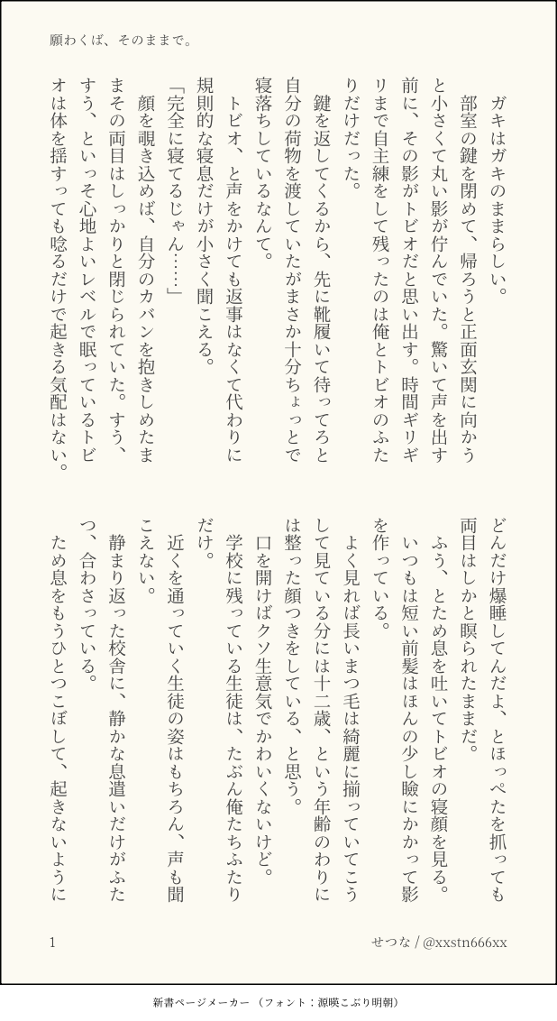 せつな。☆quiet followDONE『願わくば、そのままで』北一及影 show all(+2 images) Tap to full screen (size:618x1132).Repost is prohibited Let's send reactions! freqpopularsnackothersPayment processing Replies from the creator Follow creator you care about!☆quiet follow せつな。MENU『23時に待ち合わせ』及影ワンライまとめのまとめたやつまとめ 40 せつな。DOODLE特別なにかあるわけでもなく日常にあふれた一コマの中でぽろっとプロポーズしちゃうやつが好きなんだよね、という及影らくがき 2 せつな。DONE『魂の在り方』俳優パロ及影 9 せつな。DONE『酒のつまみにはならない』大学生ifの、モブ視点 7 せつな。DONE『仮面はいらない』ワンライお題:カフェ 5 せつな。DONE『そうして一歩、出遅れる』🇦🇷及と🇯🇵影の時差及影