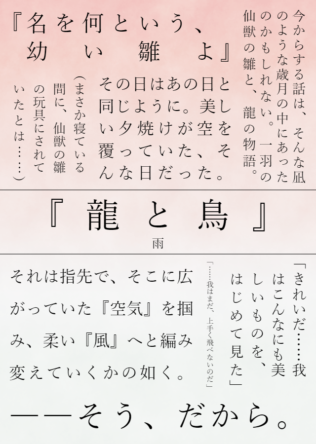 YmLiBItnyo12595☆quiet followDONE『残照』魈が子どもの頃、鍾離が飛び方を教えた思い出の話。登場人物⇒岩王(鍾離)、仙獣の雛(魈)、帰終(名前だけ)・注意事項過去含み、捏造解釈設定が多々あります。鍾魈版週ドロライ企画に投稿したものです。第2回お題③ 【龍と鳥】■表紙は「装丁カフェ様」を利用させて頂きました。(https://pirirara.com/) #鍾魈 Zhongxiao #鍾魈版週ドロライ show all(+8 images) Tap to full screen (size:640x900).Repost is prohibited Let's send reactions! freqpopularsnackothersPayment processing Replies from the creator Follow creator you care about!☆quiet follow YmLiBItnyo12595DONE『デスコミュニケーション・カンバセーション』――きっと『あなた』が、隣に居るからだ。現パロな鍾魈。先生と生徒な二人の話。・注意事項 現パロ(パラレル/並行世界)なので苦手な方はご注意ください。鍾魈版週ドロライ企画に投稿したものです。第14回お題【③大人と子ども】■表紙は「装丁カフェ様」を利用させて頂きました。(https://pirirara.com/) 6 YmLiBItnyo12595DONE『残花、一輪』「あぁ。……来ていたのか」寝ている鍾離の元に訪れた、小鳥の話。登場人物⇒鍾離、小鳥(魈)・注意事項 魈が小鳥になれる設定がついています。鍾魈版週ドロライ企画に投稿したものです。第13回お題【③名残の花】■表紙は「装丁カフェ様」を利用させて頂きました。(https://pirirara.com/) 5 YmLiBItnyo12595DONE『尋夢』『そしてこれからは、その腕に。どうかたくさんの幸福を』魈の誕生日と『嘘』に纏わる話。登場人物⇒鍾離、魈、旅人、パイモン、伐難、応達・注意事項 捏造解釈設定が多々あります。鍾魈版週ドロライ企画に間に合わなかったものです。第12回お題【魈の誕生日+嘘】■表紙は「装丁カフェ様」を利用させて頂きました。(https://pirirara.com/) 19 YmLiBItnyo12595DONE『夜桜、月下』 たとえば、そう。こんなにも美しく、穏やかで、春の訪れのように温かな――。夜桜を見る鍾離と魈の話。登場人物⇒鍾離、魈・注意事項 外景への独自解釈があります。鍾魈版週ドロライ企画に投稿したものです。第11回お題【お花見/桜+抱きしめる+『春の訪れ』】 3249 YmLiBItnyo12595DONE『名前を呼んで』「どうか、お目覚めになったら。もう一度、我の名前を呼んでください」魈が猫になって鍾離に甘やかされた日の話(『室咲』『遅咲』の続き)・注意事項 魈が猫になります。捏造解釈設定が多々あります。鍾魈版週ドロライ企画に投稿したものです。第10回お題【(画像左上参照)】■表紙は「装丁カフェ様」を利用させて頂きました。(https://pirirara.com/) 13 YmLiBItnyo12595DONE『≒//ニアリーイコール・フェアリーテイル』 両想いと片想いを同時並行していく彼らの恋物語は、こうして始まったのである。鍾魈 ×現代AU×魔法少女AU・注意事項 後天性女体化表現があります。鍾魈版週ドロライ企画に投稿したものです。第10回お題【恋のはじまり】■表紙は「装丁カフェ様」を利用させて頂きました。(https://pirirara.com/) 11 related works YmLiBItnyo12595DONE『デスコミュニケーション・カンバセーション』――きっと『あなた』が、隣に居るからだ。現パロな鍾魈。先生と生徒な二人の話。・注意事項 現パロ(パラレル/並行世界)なので苦手な方はご注意ください。鍾魈版週ドロライ企画に投稿したものです。第14回お題【③大人と子ども】■表紙は「装丁カフェ様」を利用させて頂きました。(https://pirirara.com/) 6 YmLiBItnyo12595DONE『生辰』 鍾離の誕生日を祝いに来た魈が、『暖め鳥』にされた時の話。・注意事項 捏造解釈設定が多々あります。 鍾魈版週ドロライ企画に投稿したものです。第5回『過去お題ウィーク』第4回お題①『誕生日(生辰)■表紙は「装丁カフェ様」を利用させて頂きました。(https://pirirara.com/) 17 YmLiBItnyo12595DONE『愛着』 鍾離が飼っているガビチョウを連れて、魈に会いに来た時の話。・注意事項 過去捏造設定があったり、魈が鳥の声を理解出来たり、話せたりします。鍾魈版週ドロライ企画に投稿したものです。第6回お題③『やきもち』■表紙は「装丁カフェ様」を利用させて頂きました。(https://pirirara.com/) 9 YmLiBItnyo12595DONE『遠い背中』 救われた後の金鵬が、強くなりたいと願った話。登場人物⇒金鵬(魈)、浮舎、岩王(鍾離)以前投稿した『残照』と地続きの話ですが、読まなくても大丈夫です。・注意事項 捏造解釈設定が多々あります。 鍾魈版週ドロライ企画に投稿したものです。第3回お題③ 【遠い背中】■表紙は「装丁カフェ様」を利用させて頂きました。(https://pirirara.com/) 8 YmLiBItnyo12595DONE『残花、一輪』「あぁ。……来ていたのか」寝ている鍾離の元に訪れた、小鳥の話。登場人物⇒鍾離、小鳥(魈)・注意事項 魈が小鳥になれる設定がついています。鍾魈版週ドロライ企画に投稿したものです。第13回お題【③名残の花】■表紙は「装丁カフェ様」を利用させて頂きました。(https://pirirara.com/) 5 YmLiBItnyo12595DONE『黎明』 年の終わりも始まりも、特に変わらない魈の話。(時間軸としては『生辰』の一年前くらいを想定)登場人物⇒魈、鍾離