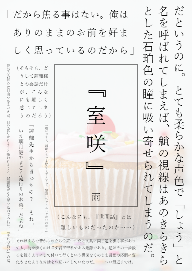 YmLiBItnyo12595☆quiet followDONE『室咲』(どうして鍾離様との会話だけが、こんなにも難しく感じてしまうのだろう)鍾離とうまく話が出来なくて、悩んでいる魈の話。登場人物⇒鍾離、魈、空、パイモン・注意事項 魈が小鳥になれる設定が付いています。鍾魈版週ドロライ企画に投稿したものです。第8回お題【①バレンタイン】■表紙は「装丁カフェ様」を利用させて頂きました。(https://pirirara.com/) #鍾魈 Zhongxiao #鍾魈版週ドロライ show all(+13 images) Tap to full screen (size:640x900).Repost is prohibited Let's send reactions! freqpopularsnackothersPayment processing Replies from the creator Follow creator you care about!☆quiet follow YmLiBItnyo12595DONE『デスコミュニケーション・カンバセーション』――きっと『あなた』が、隣に居るからだ。現パロな鍾魈。先生と生徒な二人の話。・注意事項 現パロ(パラレル/並行世界)なので苦手な方はご注意ください。鍾魈版週ドロライ企画に投稿したものです。第14回お題【③大人と子ども】■表紙は「装丁カフェ様」を利用させて頂きました。(https://pirirara.com/) 6 YmLiBItnyo12595DONE『残花、一輪』「あぁ。……来ていたのか」寝ている鍾離の元に訪れた、小鳥の話。登場人物⇒鍾離、小鳥(魈)・注意事項 魈が小鳥になれる設定がついています。鍾魈版週ドロライ企画に投稿したものです。第13回お題【③名残の花】■表紙は「装丁カフェ様」を利用させて頂きました。(https://pirirara.com/) 5 YmLiBItnyo12595DONE『尋夢』『そしてこれからは、その腕に。どうかたくさんの幸福を』魈の誕生日と『嘘』に纏わる話。登場人物⇒鍾離、魈、旅人、パイモン、伐難、応達・注意事項 捏造解釈設定が多々あります。鍾魈版週ドロライ企画に間に合わなかったものです。第12回お題【魈の誕生日+嘘】■表紙は「装丁カフェ様」を利用させて頂きました。(https://pirirara.com/) 19 YmLiBItnyo12595DONE『夜桜、月下』 たとえば、そう。こんなにも美しく、穏やかで、春の訪れのように温かな――。夜桜を見る鍾離と魈の話。登場人物⇒鍾離、魈・注意事項 外景への独自解釈があります。鍾魈版週ドロライ企画に投稿したものです。第11回お題【お花見/桜+抱きしめる+『春の訪れ』】 3249 YmLiBItnyo12595DONE『名前を呼んで』「どうか、お目覚めになったら。もう一度、我の名前を呼んでください」魈が猫になって鍾離に甘やかされた日の話(『室咲』『遅咲』の続き)・注意事項 魈が猫になります。捏造解釈設定が多々あります。鍾魈版週ドロライ企画に投稿したものです。第10回お題【(画像左上参照)】■表紙は「装丁カフェ様」を利用させて頂きました。(https://pirirara.com/) 13 YmLiBItnyo12595DONE『≒//ニアリーイコール・フェアリーテイル』 両想いと片想いを同時並行していく彼らの恋物語は、こうして始まったのである。鍾魈 ×現代AU×魔法少女AU・注意事項 後天性女体化表現があります。鍾魈版週ドロライ企画に投稿したものです。第10回お題【恋のはじまり】■表紙は「装丁カフェ様」を利用させて頂きました。(https://pirirara.com/) 11 related works YmLiBItnyo12595DONE『愛着』 鍾離が飼っているガビチョウを連れて、魈に会いに来た時の話。・注意事項 過去捏造設定があったり、魈が鳥の声を理解出来たり、話せたりします。鍾魈版週ドロライ企画に投稿したものです。第6回お題③『やきもち』■表紙は「装丁カフェ様」を利用させて頂きました。(https://pirirara.com/) 9 YmLiBItnyo12595DONE『遠い背中』 救われた後の金鵬が、強くなりたいと願った話。登場人物⇒金鵬(魈)、浮舎、岩王(鍾離)以前投稿した『残照』と地続きの話ですが、読まなくても大丈夫です。・注意事項 捏造解釈設定が多々あります。 鍾魈版週ドロライ企画に投稿したものです。第3回お題③ 【遠い背中】■表紙は「装丁カフェ様」を利用させて頂きました。(https://pirirara.com/) 8 YmLiBItnyo12595DONE『残花、一輪』「あぁ。……来ていたのか」寝ている鍾離の元に訪れた、小鳥の話。登場人物⇒鍾離、小鳥(魈)・注意事項 魈が小鳥になれる設定がついています。鍾魈版週ドロライ企画に投稿したものです。第13回お題【③名残の花】■表紙は「装丁カフェ様」を利用させて頂きました。(https://pirirara.com/) 5 YmLiBItnyo12595DONE『デスコミュニケーション・カンバセーション』――きっと『あなた』が、隣に居るからだ。現パロな鍾魈。先生と生徒な二人の話。・注意事項 現パロ(パラレル/並行世界)なので苦手な方はご注意ください。鍾魈版週ドロライ企画に投稿したものです。第14回お題【③大人と子ども】■表紙は「装丁カフェ様」を利用させて頂きました。(https://pirirara.com/) 6 YmLiBItnyo12595DONE『黎明』 年の終わりも始まりも、特に変わらない魈の話。(時間軸としては『生辰』の一年前くらいを想定)登場人物⇒魈、鍾離、旅人(空)、パイモン・注意事項 捏造解釈設定が多々あります。鍾魈版週ドロライ企画に投稿したものです。第6回お題【①初日の出+②札遊び】■表紙は「装丁カフェ様」を利用させて頂きました。(https://pirirara.com/) 10 YmLiBItnyo12595DONE『≒//ニア