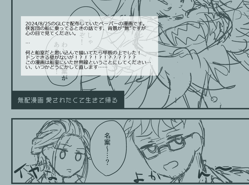 8/25イベントで配布していたペーパーの漫画でした 侠客団の船に乗ってたときの話です背景は心の目で見てね…その内ちゃんとペン入れしたいです