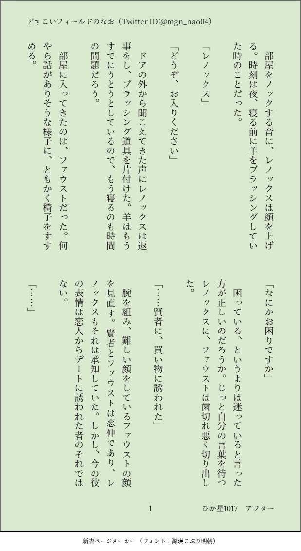 mgn_nao04☆quiet followDONEひか星1017で展示した作品(こちらもポイピク内で公開中)の前日譚です。ファウ晶♂前提で、ファウストがレノックスにデートの相談しているSSです。関係者の皆様、楽しいイベントをありがとうございました! show all(+2 images) Tap to full screen (size:618x1132).Repost is prohibited Let's send reactions! freqpopularsnackothersPayment processing Replies from the creator Follow creator you care about!☆quiet follow mgn_nao04DONE風花雪月、レトユリです。性的表現を含むため、未成年者の閲覧はかたくお断りいたします。1部の頃にユーリスがベレト先生の童貞を狙うお話です。・支援会話・支援Sのネタバレがあります。・ルートの指定は特にありません。・名前は出てきませんが、第三者とユーリスの肉体関係(モブユリ)を匂わせる表現があります。・画像8枚目は支援S後のお話です。 8 mgn_nao04DONE2023年5月5日開催、「ちびまほ!3」の展示作品です。心身ともに幼くなった晶くんにルチルやミチル、ネロがご飯を食べさせるお話です。リアル幼児とのふれあい経験がないものが書いております。 1908 mgn_nao04DOODLE2023年5月5日開催「ちびまほ!3」の展示作品です。心身ともに幼くなった晶くんの面倒を見ているファウストのお話です。リアル幼児とのふれあい経験がない者が書いています。 1245 mgn_nao04DONE2023年2月11日開催晶くんオンリー「ひかる星々の名前を教えて」展示作品です。ファウ晶♂のSS、現パロとなります。今回は内容の都合上、18歳未満の方の閲覧をお断りしております。ご注意ください。 3622 mgn_nao04DONE2023年2月11日開催の晶くんオンリー「ひかる星々の名前を教えて」の展示作品です。魔法使いを嫌う村にやってきた東の魔法使いと、晶くんのお話です。 1365 mgn_nao04DONE2022/10/15 晶くんオンリー「ひかる星々の名前を教えて」展示作品です。現パロ、年齢操作など捏造てんこ盛りですがそれでもよろしければどうぞご覧くださいませ。パスワードはお品書きにてご確認くださいませ。 2273