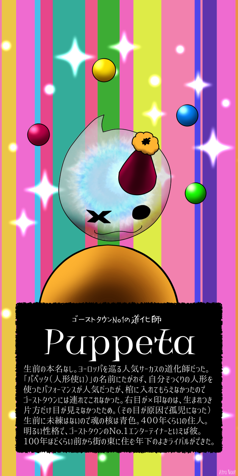 右目が生まれつき見えなかったために両親にサーカス団に二束三文で売られ、道化師として「人形使い=パペッタ」と呼ばれ数々のパフォーマンスを身に着けた。
