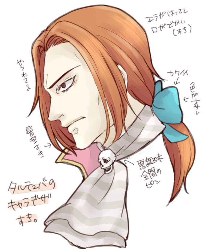 タルテュバにいさんのキャラデザ好きなんだよなぁ。ピンクの上着と青緑のおリボンがオサレ。悪趣味なドクロのピンも好き。