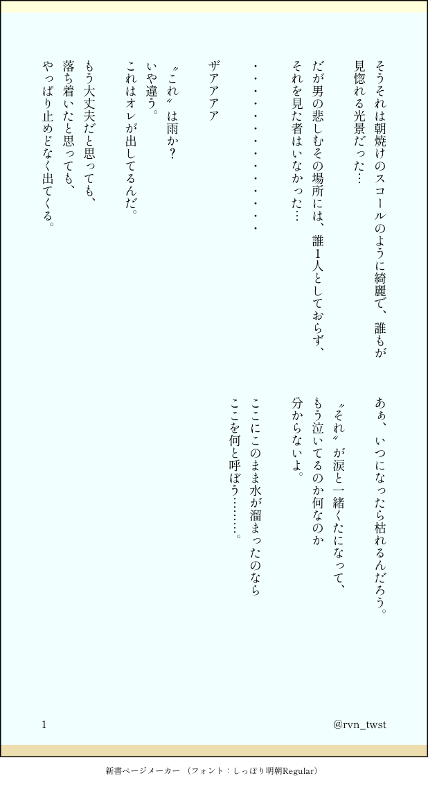 rvn_twst☆quiet followDONE熱砂の宝石は今日も輝く(小説)5Pあるオアシスの伝説について砂漠を歩く男2人が話す話。題名は最後まで見れば分かります。 #熱砂の宝石は今日も輝く show all(+4 images) Tap to full screen (size:618x1132).Repost is prohibited Let's send reactions! freqpopularsnackothersPayment processing Replies from the creator Follow creator you care about!☆quiet follow rvn_twstPROGRESSフラワースタンド最新状況です🎶企画に間に合わなかったという方もいらしたので、せめてイメージ図を見られるようにこちらに掲載します! rvn_twstPROGRESSフラスタイメージです!2〜4枚目にそれぞれのパネル入れました! 4 rvn_twstSPOILERこの度は新刊をお迎え下さりありがとうございました!!涙今回分かりにくい箇所が多々あったかと思うので少しばかり解説画像を用意しました!勝手にQ&Aにしています😭演出とか設定を語ってても嫌でなければ、良ければどうぞ!PASS:ラストから2ページの小説QR上ジャミルのセリフ三文字「〇〇〇・・・」 3 rvn_twstDONE「1番贅沢な願い。」のれん6展示。誕生日にジャミルがプレゼントをくれる話。これがカリム君が願う中で1番贅沢で大切なものであると思っています。高価で"良い"ものを知っている彼が1番願うもの…これからの2人の関係性が凄く凄く楽しみです。誕生日おめでとうカリム君。 12 rvn_twstDONE熱砂の宝石は今日も輝く(小説)5Pあるオアシスの伝説について砂漠を歩く男2人が話す話。題名は最後まで見れば分かります。 5 rvn_twstDONE熱砂の宝石は今日も輝く(無配)「宝物」カリムくんの宝物はきっとお金で買えない思い出かなというところから描きました。絨毯くんも大切な友達なので、撮影手伝ってくれたよっていうので最後におまけつけました。お詫びトレイが左利きになってました。ミスです、申し訳ありません。 8 related works rvn_twstDONE熱砂の宝石は今日も輝く(小説)5Pあるオアシスの伝説について砂漠を歩く男2人が話す話。題名は最後まで見れば分かります。 5 rvn_twstDONE熱砂の宝石は今日も輝く(無配)「宝物」カリムくんの宝物はきっとお金で買えない思い出かなというところから描きました。絨毯くんも大切な友達なので、撮影手伝ってくれたよっていうので最後におまけつけました。お詫びトレイが左利きになってました。ミスです、申し訳ありません。 8 recommended works 55tunatunaODONE人外化(下半身蛇化)注意 サブさかなMOURNING幾星霜の夜を越えて/ジャミカリ※ボツネタを供養します※マンガにするつもりで書いたネタメモであって、小説ではないです。※全く調べておらず、ふわっとした気持ちで書いています。 1454 rollshi_pp0DONE「Thank you for being born」魔法のアルバムでジャミルの気持ちを知るカリムのお誕生日漫画。 12 リュリュDONEお人形のセンシティブ画像😇パート2🐍🦦❤️❤️❤️ peach_yukariDONEポッキーの日!!ポッキーゲームをジャミル以外としようとしてジャミルが横取りしてくやつ ricomottiDONEのれん4無配漫画(全年齢)両片思いの二人が夜明けを共にする話です。 6 おりはDONE・のれん4開催おめでとうございます!・年越しジャミカリ🐍☀️の短い漫画です(2P) 2 すがきちDOODLEジャミカリ ⚠️女体化バニ〜りむ🐰のイラストと描いてて途中で描いたらくがき2枚3枚目はジャミルにお披露目した時イメージです(画像に書きそびれた)01/17画像3枚追加しました🐰🐍 6 芩卿wMAIKING🏛💍🌱草稿流啊啊啊