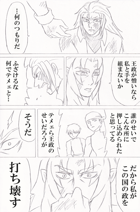 サークルメンから「自分が描いていない(これから描く予定もない)土地の話を描いてみない?」と話を持ち掛けられた時、「この世界にヒュブリスが居たら…」を考え、そこから生まれたのがこの下剋上物語なんだけど……彼といえど、いくら強くても一人では事は成せない。だから『仲間を得る過程』を考えなきゃならなかった。