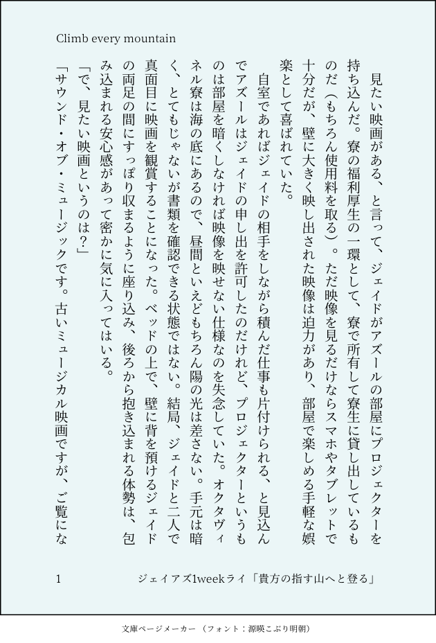 n.カルーア☆quiet followDONEジェイアズジェイアズワンウィークドロライ第三回「貴方の指す山へと登る」お部屋で映画デートするジェイアズ。長いもだもだ期間を経てようやく付き合い始めたので、探り合いの空気が抜けないのにメロメロにラブいというちょっとバグった状態の二人。「Climb every mountain」 show all(+11 images) Tap to full screen (size:630x928).Repost is prohibited Let's send reactions! freqpopularsnackothersPayment processing Replies from the creator Follow creator you care about!☆quiet follow n.カルーアINFOリバサンコイチゲスト本通販のお知らせ前も後ろも使ってラブラブなサンコイチが読みたい一心で、ゲスト本を出す運びとなりました!(ゲスト探しが現在も継続中ですので、ここからさらに執筆者が増える可能性があります)発行は九月ですが、予約は受付開始しております。https://ec.toranoana.jp/joshi_r/ec/item/040031255463※イベント頒布は未定です。 13 n.カルーアDOODLEジェイアズ。なんでも学習してしまうアズと、イマジネーションに溢れるいい子のウツボ。「人魚と蝶」 4 n.カルーアDOODLEイドアズ(つきあってない)の日常の一幕「イス取りゲーム」 5 n.カルーアDOODLEジェイアズが初交尾出来なかった話。ジェは部屋で泣いてるので、出てくるのはアズとフロだけです。「ハジメテ」 7 n.カルーアDONE #フロアズワンウィークドロライ第70回「ラブソング」ウツボとタコのラブソング歌合戦に巻き込まれてメロメロになるモブ寮生がいます。「My prince will come」 10 n.カルーアDONE #フロアズワンウィークドロライ第69回「告白」ラウンジの女性客にウツボが告白されているのを目撃したアズと、誰かが密かに想うことすら承服しかねるフロ。ジェはいつも通り。「はらのなか」 9