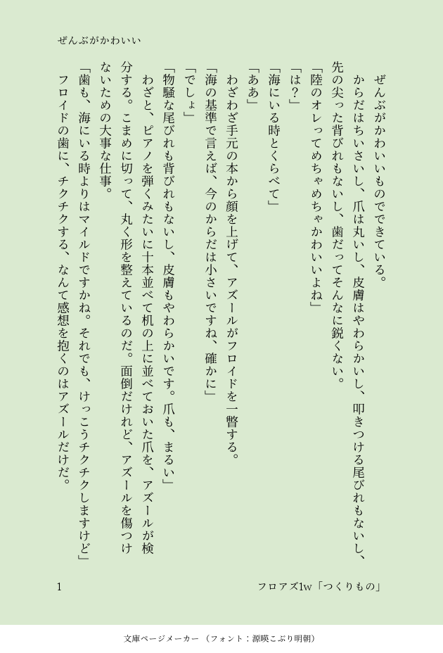 n.カルーア☆quiet followDOODLEフロアズ1week第四十回目「つくりもの」#フロアズワンウィークドロライ付き合い始めて日が浅いのでなんとなくほやほやしてるフロアズ。今日のフロはかわいいの気分だった様子。ジェもいる。「ぜんぶがかわいい」 show all(+7 images) Tap to full screen (size:630x928).Repost is prohibited Let's send reactions! freqpopularsnackothersPayment processing Replies from the creator Follow creator you care about!☆quiet follow n.カルーアINFOリバサンコイチゲスト本通販のお知らせ前も後ろも使ってラブラブなサンコイチが読みたい一心で、ゲスト本を出す運びとなりました!(ゲスト探しが現在も継続中ですので、ここからさらに執筆者が増える可能性があります)発行は九月ですが、予約は受付開始しております。https://ec.toranoana.jp/joshi_r/ec/item/040031255463※イベント頒布は未定です。 13 n.カルーアDOODLEジェイアズ。なんでも学習してしまうアズと、イマジネーションに溢れるいい子のウツボ。「人魚と蝶」 4 n.カルーアDOODLEイドアズ(つきあってない)の日常の一幕「イス取りゲーム」 5 n.カルーアDOODLEジェイアズが初交尾出来なかった話。ジェは部屋で泣いてるので、出てくるのはアズとフロだけです。「ハジメテ」 7 n.カルーアDONE #フロアズワンウィークドロライ第70回「ラブソング」ウツボとタコのラブソング歌合戦に巻き込まれてメロメロになるモブ寮生がいます。「My prince will come」 10 n.カルーアDONE #フロアズワンウィークドロライ第69回「告白」ラウンジの女性客にウツボが告白されているのを目撃したアズと、誰かが密かに想うことすら承服しかねるフロ。ジェはいつも通り。「はらのなか」 9 related works n.カルーアDONE #フロアズワンウィークドロライ第67回「ガラス越し」街中でさりげなく無自覚にじゃれあうフロアズとニコニコ見てるジェ。「よんで、」 7 n.カルーアDOODLE #フロアズワンウィークドロライ第42回目「歌声」無自覚両片想いフロアズ。前回のお話のアズ視点。フロがアズの声だけ聞こえなくなったと聞かされたアズの話。ジェは後方保護者ズラをしている。「僕を聞いて」 9 n.カルーアDOODLE #フロアズワンウィークドロライ第66回「落下」「二人きり」冬のSF(すこしふしぎ)に巻き込まれるフロアズ。「冬の隙間」 9 n.カルーアDOODLE #フロアズワンウィークドロライ第68回「自由」自由にしたいフロと、自由にならない世界。それでも好きだなぁと思う話。「世界ってやつは」 6 n.カルーアDOODLE #フロアズワンウィークドロライ第65回「痛覚」ピアスホールなんて開けるやつの気が知れないけど、つけてと言われたらつけてやるアズの話。「ふたりのかたち」 7 n.カルーアDONE #フロアズワンウィークドロライ第70回「ラブソング」ウツボとタコのラブソング歌合戦に巻き込まれてメロメロになるモブ寮生がいます。「My prince will come」 10 n.カルーアDOODLEフロアズ1week第四十回目「つくりもの」#フロアズワンウィークドロライ付き合い始めて日が浅いのでなんとなくほやほやしてるフロアズ。今日のフロはかわいいの気分だった様子。ジェもいる。「ぜんぶがかわいい」 8 n.カルーアDONE #フロアズワンウィークドロライ第69回「告白」ラウンジの女性客にウツボが告白されているのを目撃したアズと、誰かが密かに想うことすら承服しかねるフロ。ジェはいつも通り。「はらのなか」 9 recommended works n.カルーアDONEジェイアズ#さみしいなにかをかく【カルーアさんは黄砂が家のベランダの手すりに降り積もっていた日、庭のちいさな噴水の前で見つけた本に挟まっていた押し花の話をしてください。】「押し花」 3 n.カルーアDOODLE #ジェイアズワンウィークドロライ第48回「やはり懲りてませんね」陸一年生、夏至の頃のジェイアズ。世界が美しく見えるのは陸が興味深いからというだけでもないと、そのうち知るといい。「屋根の上のぼくら」 9 n.カルーアDOODLE #フロアズワンウィークドロライ第42回目「歌声」無自覚両片想いフロアズ。前回のお話のアズ視点。フロがアズの声だけ聞こえなくなったと聞かされたアズの話。ジェは後方保護者ズラをしている。「僕を聞いて」 9 n.カルーアDONE #ジェイアズワンウィークドロライ第50回「縫い留めた心ごと」お互いの想いを打ち明けることができず身体だけの関係を続けていたジェイアズのジェが、ある日限界を迎えてアズの元から飛び出してぬいぐるみやさんになる話。「心臓は翡翠で出来ている」 18 n.カルーアDOODLE #ジェイアズワンウィークドロライ第51回「毒薬」♪シャラララララ……「恥ずかしがり屋の男の子」 8 n.カルーアDOODLE #ジェイアズワンウィークドロライ第52回「月」シロツメクサの真ん中で寝転ぶジェがきれいでかわいくて少し見惚れたことは内緒。アズと仲良くジェをかわいがるフロがいます。「シロツメクサの海」 7 n.カルーアDOODLE #ジェイアズワンウィークドロライ最終回「海」寮の外の海にどんどん泳ぎ出してそのまま踊り出すピカピカウツボと番と兄弟。企画の運営ありがとうございました!「ウ