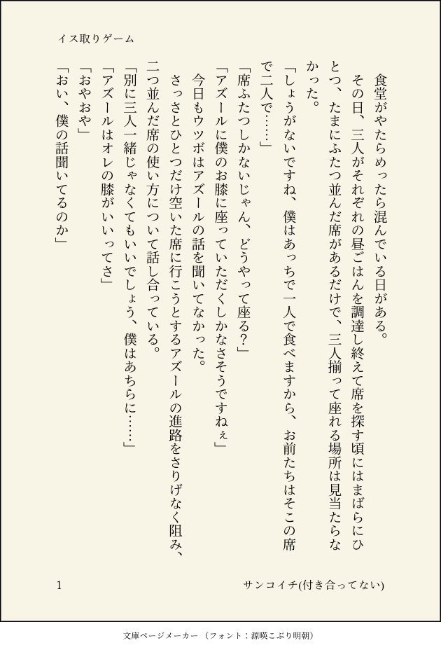 n.カルーア☆quiet followDOODLEイドアズ(つきあってない)の日常の一幕「イス取りゲーム」 show all(+4 images) Tap to full screen (size:630x928).Repost is prohibited Let's send reactions! freqpopularsnackothersPayment processing Replies from the creator Follow creator you care about!☆quiet follow n.カルーアINFOリバサンコイチゲスト本通販のお知らせ前も後ろも使ってラブラブなサンコイチが読みたい一心で、ゲスト本を出す運びとなりました!(ゲスト探しが現在も継続中ですので、ここからさらに執筆者が増える可能性があります)発行は九月ですが、予約は受付開始しております。https://ec.toranoana.jp/joshi_r/ec/item/040031255463※イベント頒布は未定です。 13 n.カルーアDOODLEジェイアズ。なんでも学習してしまうアズと、イマジネーションに溢れるいい子のウツボ。「人魚と蝶」 4 n.カルーアDOODLEイドアズ(つきあってない)の日常の一幕「イス取りゲーム」 5 n.カルーアDOODLEジェイアズが初交尾出来なかった話。ジェは部屋で泣いてるので、出てくるのはアズとフロだけです。「ハジメテ」 7 n.カルーアDONE #フロアズワンウィークドロライ第70回「ラブソング」ウツボとタコのラブソング歌合戦に巻き込まれてメロメロになるモブ寮生がいます。「My prince will come」 10 n.カルーアDONE #フロアズワンウィークドロライ第69回「告白」ラウンジの女性客にウツボが告白されているのを目撃したアズと、誰かが密かに想うことすら承服しかねるフロ。ジェはいつも通り。「はらのなか」 9 recommended works n.カルーアDONEジェイアズ#さみしいなにかをかく【カルーアさんは黄砂が家のベランダの手すりに降り積もっていた日、庭のちいさな噴水の前で見つけた本に挟まっていた押し花の話をしてください。】「押し花」 3 n.カルーアDOODLEフロアズ1week第四十回目「つくりもの」#フロアズワンウィークドロライ付き合い始めて日が浅いのでなんとなくほやほやしてるフロアズ。今日のフロはかわいいの気分だった様子。ジェもいる。「ぜんぶがかわいい」 8 n.カルーアDOODLE #ジェイアズワンウィークドロライ第48回「やはり懲りてませんね」陸一年生、夏至の頃のジェイアズ。世界が美しく見えるのは陸が興味深いからというだけでもないと、そのうち知るといい。「屋根の上のぼくら」 9 n.カルーアDOODLE #フロアズワンウィークドロライ第42回目「歌声」無自覚両片想いフロアズ。前回のお話のアズ視点。フロがアズの声だけ聞こえなくなったと聞かされたアズの話。ジェは後方保護者ズラをしている。「僕を聞いて」 9 n.カルーアDONE #ジェイアズワンウィークドロライ第50回「縫い留めた心ごと」お互いの想いを打ち明けることができず身体だけの関係を続けていたジェイアズのジェが、ある日限界を迎えてアズの元から飛び出してぬいぐるみやさんになる話。「心臓は翡翠で出来ている」 18 n.カルーアDOODLE #ジェイアズワンウィークドロライ第52回「月」シロツメクサの真ん中で寝転ぶジェがきれいでかわいくて少し見惚れたことは内緒。アズと仲良くジェをかわいがるフロがいます。「シロツメクサの海」 7 n.カルーアDOODLE #ジェイアズワンウィークドロライ最終回「海」寮の外の海にどんどん泳ぎ出してそのまま踊り出すピカピカウツボと番と兄弟。企画の運営ありがとうございました!「ウィークエンド・ダンス・タイム」 8 南国カルーアDOODLE一緒に暮らしているキラキス。救命講習受講済みのふたり。「フローズンキス」 7 南国カルーアDOODLE一緒に暮らしてるキラキス。今日はとても寒い。 4