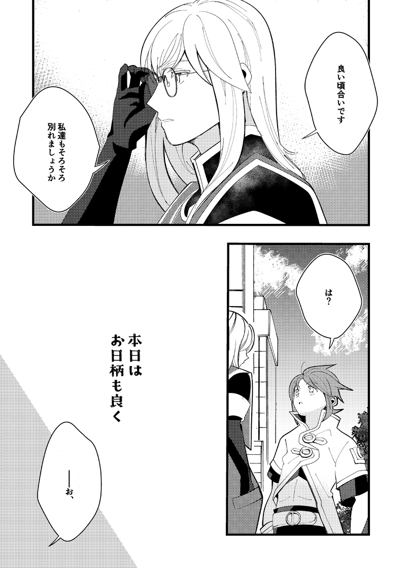 その日も何軒かの店に顔を出して、ほどほどの所で切り上げて帰ってきた。ほどほどだったと思う。日付が変わってからほんのちょっとしか経ってないし。きれいなお姉さんを連れ込まなかったし。自分の足で商館に帰れるくらいしか飲まなかったし。火の落ちた厨房で汲み上げた水を飲んでいると、寝巻きを着込んだヴィッテルが食器を持って厨房へ入ってくる。夜食でもつまんでたんだろう。俺は右手をひらりと上げて、ヴィッテルはぺこっと頭を下げてそれぞれ挨拶を交わした。