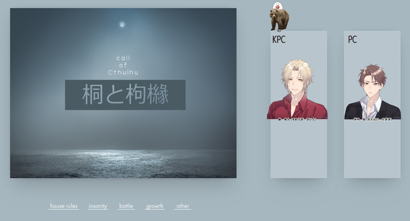 syuuya_trpg☆quiet followDONE「桐と枸櫞」(CoC6版)KPC 皇 魁人/しゅーやPC/PL 冴内 環/いちごさんEND1で終了です~!!二人仲良くスープストック〇ーキョーであったけぇスープ飲んでね♡ Tap to full screen (size:1217x655).Repost is prohibited Let's send reactions! freqpopularsnackothersPayment processing Replies from the creator Follow creator you care about!☆quiet follow syuuya_trpgDOODLE「今日はサクサクルースのクッキーを作ります」(CoC6版)KP:ささみさんPL:知葉さん、するめいかさん、inadaさん、しゅーやけに会でした~、とっても私は概念けにで出動しました。ワイワイ色んなけにさんと交流楽しかったです! syuuya_trpgDONE「同じ空には昇れない。」(CoC6版)KP:しゅーや SKP:inadaさんHO太陽 三宙 悠大/まちこさんHO月 ユオ/しいのさんENDB-1Aで終了しました。腹抱えて笑いまくりの楽しい2陣さんでした!ありがとうございました~!! syuuya_trpgDONE【同じ空には昇れない。】KP しゅーや/SKP いなださんHO太陽 白玖聿灯(Fu)HO月 不知火哀(りょかさん)☀無事シナリオ終了しました☾ syuuya_trpgDONE「絶対澪度の愛し方」(CoC6版)KP:さくさんPC/PLHO1:峰雪 一冴/しゅーやHO2:峰雪 聖蘭/飴月さんEND-B 両ロスで終了しました!可愛い妹、ニコニコ たのしかったねぇ syuuya_trpgDONE「いい子にしてるか黙ってろ」(CoC6版)KPC:七瀬 莉生/眠いさんPC/PL:坂巻 葉瑠/しゅーやEND-Aで終了です!胡乱継続でバッチリ合ってた~!!莉生くんに対して懐が大海すぎる葉瑠の出目が良すぎました(7c2f)ありがとうございました!! syuuya_trpgDONE「星に彩、海に調」(CoC6版)KP:まぎさん🌌HO1:アーテル/🦐さん🌌HO2:カゲツ/しゅーや🐋HO3:オトヒメ/inadaさん🐋HO4:トヨヒメ/飴月さんEND-Aで終了しました!全員漢だったな……最高メンバーで最高のRPしてきました!すげぇシナリオだった……すっげぇ楽しかった…… recommended works 夏の枝蛙DOODLE NOREIDONE[2023/08/21]🎁 2 sumeragi_4323DOODLEワンクッション(全2枚)-@スメラギ 2 MARUROKU_1111DONEkiis//姫始め(菊始め)kis×🐍4118歳未満は御遠慮くださいpass:18⤴︎︎(yes/no) 2 kumaosoCAN’T MAKEスグリ、10代後半で筋トレにハマって無駄にムキムキになってそう choja_fPROGRESS 6 Kanatanagi626SPOILER異能警察は英雄じゃない現未✖うちのほさん可愛いっていう落書きです早く通過したい~!!!#イラスト #凪部屋 2 kamonegi0222DOODLEメン世界の島根にいるティキとアスカの元で年末年始を迎える一本釣(存在しない記憶 4 meltymoon1225DONE雑渡さんは手練れなので返り血なんて浴びなさそうだけど、それはそれとして返り血を浴びた雑渡さんを見たかったという絵