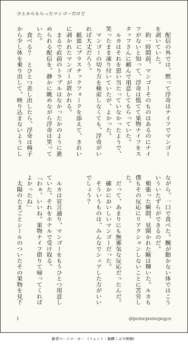 ごみばこ☆quiet followDOODLE👟🔮with 🥭 #shuuki show all(+3 images) Tap to full screen (size:618x1132).Repost is prohibited Let's send reactions! freqpopularsnackothersPayment processing Replies from the creator Follow creator you care about!☆quiet follow ごみばこDOODLEリハビリの🔮と👟 香水コラボについて 4 ごみばこDONE💛❤ エロです(ぬるい) 6 ごみばこDOODLE👟🔮のけんか 5 ごみばこDOODLE🥽♥🥽お誕生日に書いたのを忘れていました 4 ごみばこDOODLE👹🐑 ちょっと痛い描写ありなんでも許せる人向けモルヒネについては完全にフィクションです本番はないけど露骨なので鍵 4 ごみばこDOODLE👟🔮with 🥭 4 related works violetashuPROGRESSHaven’t written in ages pls be patient because there might be grammatical errors but do enjoy 😋 3737 ぐりもMOURNING💜と🟣が何かいい感じになってしまった話多分付き合ってるどっちがどっちかも未定 815 CandyMagic_3_CAN’T MAKE💜🟣モブ女視点かつてアイドルだった🟣が、数年越しに俳優💜と同棲している話密かに好きだった人が読んでくださっていたことを知り調子に乗りました。 3668 🐬 / finTRAINING👟(→)←🔮 ほぼワンライ(修正しました)言葉が足りない奴らの相互不理解についてあんまり何も考えないで読んでください 2015 bonnou85DOODLE💜🟣の話。まえにツイートしたヤツの長い版。💜がDTじゃない世界線。18⤴︎?y/n 4444 ■墓地■DONE小話:💜🟣なぜかたびたび”3人目”になる💜と、それについて物申したい🟣の話特に名前は出ていない他事務所の誰かが一瞬だけいます 2996 ■墓地■DONE小話:💜🟣🟣が💜の足の先に"いたずら"する話ただそれだけではあるものの、ちょっぴりすけべの雰囲気がします付き合い始めてからまだ日が浅い感じのふたり 2952 nattogopanDONE🟣💜(💜🟣でも可)お洒落な🟣と不安になっちゃう💜の話ナチュラル同棲中。 13 しゅしゅDONE👟×🔮の当社比可愛らしいえっちを書いたつもりです🙌大好きな作家さんの👟に振り回される🔮が可愛すぎて影響受けて書いちゃいました🙌♡喘ぎあります🔞問題があるようでしたら取り下げます…!!パス18↑ y/n 5505 recommended works hitDOODLEアルバーンノックスのこと知る度に好きになる要素しかない🎭🐈💖 やっぱり//🐏DONE学パロ🔮&🐏※小説初挑戦0から100まで完璧なる妄想です~!!!学パロと楽曲パロですが、めちゃくちゃ歌詞の自己解釈が入ってます!原作:『あの夏が飽和する』https://www.youtube.com/watch?v=2hz0lhAs0Kgふーふーちゃん大好きオタクがラクシとノクティクスのメンバー、ENの先輩方を巻き込んでの妄想を繰り広げています。続きます。 6420 やっぱり//🐏DONE🔮&🐑。「あの夏が飽和する」パロタイトル通り人を殺しちゃった🔮が、人を殺してない🐑と一緒に逃避行に行く話です。ふーちゃんの「自己犠牲の男」て感じが大好きなので、勝手に設定盛りまくりました。学パロ&歌パロです。詳しくは前話を参照ください。 8446 Maru_mame_3DOODLEにじさんじENboysまわりに関する落書き帳。Twitterに載ってたり載ってなかったり。随時追加するかもしれない。 21 YataDONEヒノアラシ&アイキー(眼鏡ありなし差分)ふわぷに浮奇 3 かりすDOODLE👟くんのらくがきとか未完成絵の下書きとかTwitterに上げてたものまとめ 8 minorigiDOODLEシュウくんらくがき 2 can7t_eat_meDONEここにいなくてもずっと家族 ユウナDOODLEVox Akumaに人生狂わされてるの図🤪 4