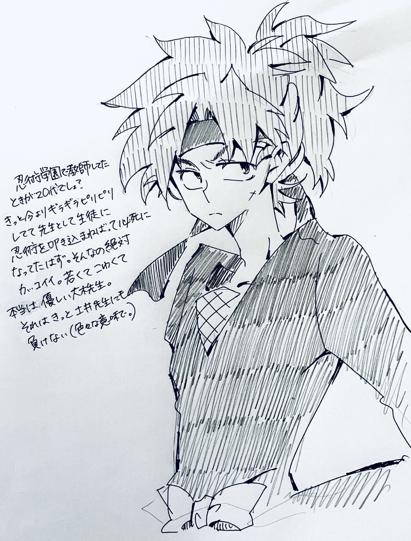 大木先生。野村先生との早食いに負けて忍術学園辞めたなんて嘘。って俺は25年前くらいから思ってる。20代で教師って職を手放すなんて絶対忍者としての辛い経験とか教え子の死とかに耐えられなくなったんだと…それを漫画にしたいんだけど技術が無くて形にならない😭野村先生は自分との勝負で忍術学園辞めるって言うのが嘘って気づいてる。本当の理由も知ってる。だから怒ってるけど友情で許してくれる。その関係も良いって思