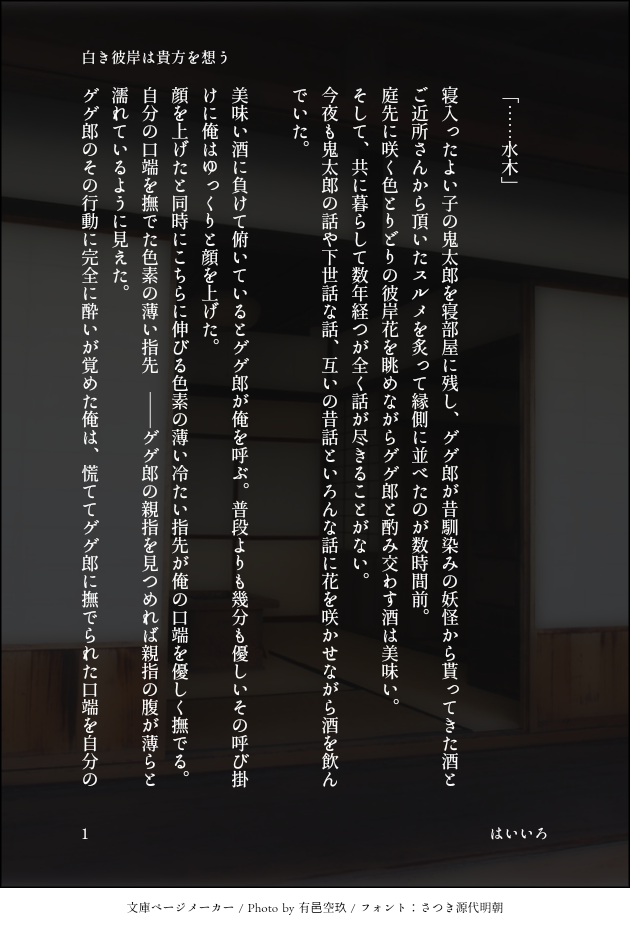 はいいろ☆quiet followDONE父に片想いしている水木の噺父水両片想いの噺⚠なよなよ系水※父水/水視点※SSメーカーさん利用作品・全9頁 show all(+8 images) Tap to full screen (size:630x928).Repost is prohibited Let's send reactions! freqpopularsnackothersPayment processing Replies from the creator Follow creator you care about!☆quiet follow はいいろDONE八尺様パロ①(https://poipiku.com/9276311/9900446.html)②(https://poipiku.com/9276311/10155320.html)の続編『父』を想う子の噺個人的に書くの楽しくて止められない、最低あと一つは続く予定⚠死ネタあり・不穏系※八尺様父×転生記憶なしのショタ水/鬼視点※SSメーカーさん利用作品・全14頁(表紙別) 15 はいいろDONE9月15日 『この傷跡ごと愛してくれ 弍』限定作品折本になります!こちらWeb版を折本にしました⬇(https://x.com/lastactionThe/status/1761052981716468223?t=rAy-kzTOr4rG9zj3eJoUxg&s=19)Web版と内容は何も変わりません。紙で欲しい方、折本とは?と気になる方は次にお進みください😊 3 はいいろDONE父に片想いしている水木の噺父水両片想いの噺⚠なよなよ系水※父水/水視点※SSメーカーさん利用作品・全9頁 9 はいいろDONE父水版ワンドロワンライ作品お題「よかった ①お主でorお前で / ②お主がorお前が」→「①お前でよかった」⚠️💧死ネタ(最後はハッピーエンド)⚠️良くない事情で亡くなった水と道先案内人を申し出た父の話※父水/水視点※SSメーカーさん使用作品・全11頁 11 はいいろDONE⚠⚠これはモブ×鬼🔞作品です⚠️⚠️妖怪ポストに届いた一件の依頼から始まる鬼監禁🔞噺連れ去り/監禁/強姦/着衣/二人とも♡喘ぎ/鬼を女性比喩表現あり/軽めの🔞だと思っている…※モブ鬼/鬼視点※🔞作品に伴いPassword付⬇もう一度問います、モブ鬼ですよ??大丈夫ですか?18歳以上ですか?(y/n) 2915 はいいろDONE以前書かせて頂きました素敵八尺様パロ(https://poipiku.com/9276311/9900446.html)の続編というかおまけ?が浮かんだので書きましたァ!!水が居なくなってから数年後の話……※八尺様父×転生記憶なしのショタ水/モブ視点※SSメーカーさん使用作品・全10頁 10