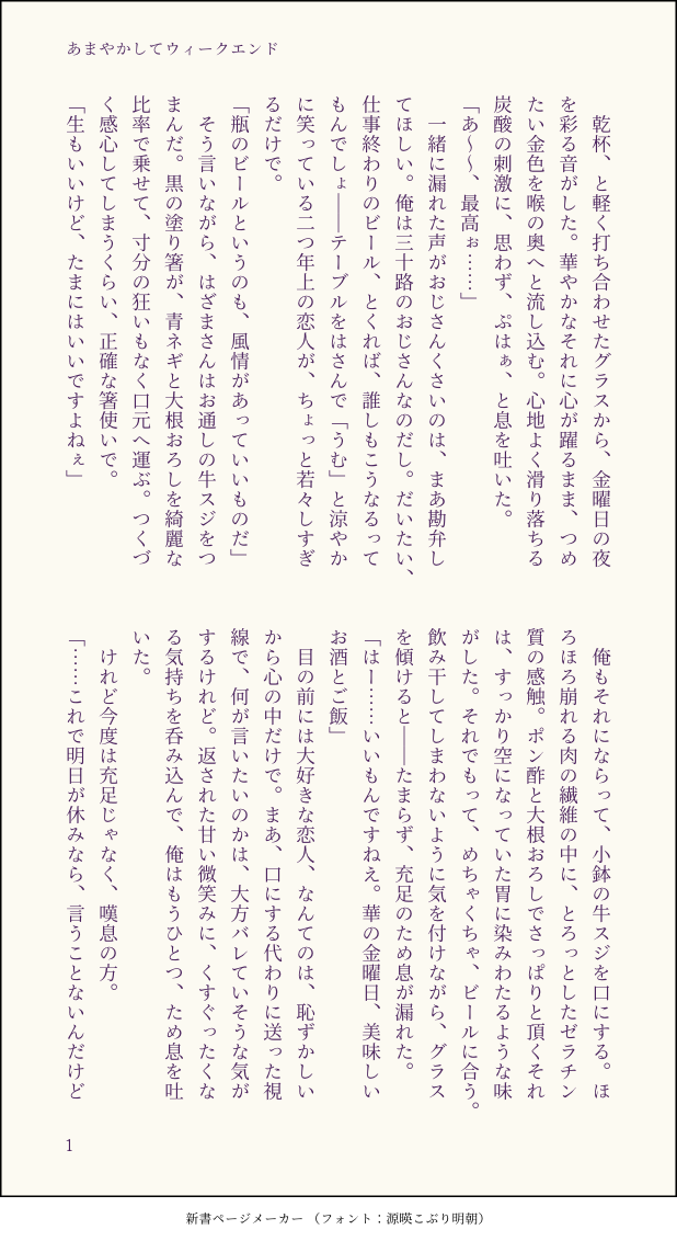 梅春和歌☆quiet followDONE『あまやかしてウィークエンド』(硲山)ねつさん(@pajama3805)とプロットを交換して、硲山を書かせていただきました〜〜!!いっぱいご飯を食べて、かるくお酒を飲む硲山の話です。ひたすらいちゃいちゃしているだけ。もうね……プロットが……本当に……かわいくて……!!最高に楽しく書かせていただきました!!本当にありがとうございました……! #硲山 hazayama show all(+15 images) Tap to full screen (size:618x1132).Repost is prohibited Let's send reactions! freqpopularsnackothersPayment processing Replies from the creator Follow creator you care about!☆quiet follow 梅春和歌DONE『ずうっといっしょ!』(🦇×🐺)タイトルと着想は某曲から。🦇さんが🐺さんの髪の毛を乾かすだけの話。離れてしまったあとで消えない傷になりたいと願うのと、何があっても離さないから傷になどしないと勝手に誓うの、どっちが重くて湿度高いんだろうね〜〜と思いながら書きました。🦇さんに湿度高く重くあってほしい気持ちが滲み出ている気がします。🐺さんが本当になにも知らないのかは、ご想像におまかせ。 8 梅春和歌DOODLE『きみはカフェインレス』(🦇×🐺)付き合ってる時空の、特になんでもない2人の夜。コーヒーを飲もうとする🐺さんと、それにストップを掛ける🦇さんの短い話です。 6 梅春和歌DOODLE『満たして欲望、愛して支配』(硲山)ふぃふす展のビジュアルがやばすぎて気が付いたら書き上がっていました。パッションだけで書いたのでだいぶ荒いです。はざやまの体格差と顔立ちの差がとんでもねえというだけの話。解釈もくそもないです。ぬるいけどスケベしてるのでR-18。🗝:18↑? y/n 8 梅春和歌DONEウルトラヒロイックHO2をやってる男が片っ端から刺さるオブザイヤー2024だったので、カッとなって描きました。みんな大好き。⚠️2枚め以降はネタバレもちょっとありの好きなとこ語り。ウルトラヒロイックの以下セッションの軽いネタバレを含みますのでご注意ください。・馬天道場ヒロイック・きてどちヒロイック・煩悩ヒロイック・すしぜむヒロイック・おきくらヒロイック 7 梅春和歌DONE『ルビンの首輪』(🦇×🐺)まだ付き合ってない🦇(→)(←)🐺にうっかり首を突っ込んだ👊ちゃんが、ふたりのド重感情に伴う人外的ムーブに振り回される話。⚠️🐺さんのチョーカーと、🦇さんの生家と、吸血鬼及び狼男の生態について、もりもり捏造しました。この話ではそういうもんなんだな……と思ってください。なんならもうパラレルワールドだと思っていただけると助かります。 11 梅春和歌DONE『其の口は愛で開く』(🦇×🐺)ゆるくてほんのりあまい、お茶の時間の話。×というか、どちらかというと🦇→→🐺。🦇さんが料理上手なのと、どちらかといえばしてあげたがりなのが好きです。尽くすタイプというか。🦇さんからの愛情を享受することに慣れている🐺さんも好きです。でも決してもらうばかりではない🐺さんも好き。なんだかそういう話です。 12 related works suzukakenDOODLEどうしても死んでしまう山下次郎の話。続くよ大昔に書いたネームの一部掘り返し。細かいところは描かない。硲山になるやつ。 2 suzukakenDONE下書きだけしてたの発掘した。硲山。寝不足が続いた硲は事務所でポンコツになっててほしい。 jakoooooooonDONE出来心ですすみません suzukakenDONE今回のイベント、ずっとこう思って次郎のとこ歩いてる。 2 suzukakenDONE硲山。 梅春和歌DONE『とっておきの唄』硲山硲さんに、好きな人いるの?って聞く次郎ちゃんの話。共に生きてゆくことを選んだ、ちょっとだけ未来のふたりのはなしです。イメージ的には5〜10年くらいの間。年取ったりとかそういう描写がちょっとだけあるので、苦手な方はお気をつけて。 8 suzukakenDOODLE硲山。最近描いてなかったので(シブにまとめられる量がなかった)おめー硲山描いたと思ったらだいたいこんな感じのばっかり描いてんな?しってるー。身長差とか体格とかモノともせずにぐいぐい押して欲しいんですよ硲には。硲のほうがDa値とか体力が上なのいいよね~5話のEDで次郎をおぶって階段登ってて、硲やべえな…って思ったりしたよステくんの衣装いいよね。もうひとりきてほしい… suzukakenDOODLEロジヴァン様とカラフルゾンビを描きたい季節になりましたね(???) suzukakenDOODLEペーストでアップロードできんじゃーん!(昨日気づきました)よき。硲山。アニメのEDで硲が次郎背負って階段上がってた(トレーニング)ときに「そうか体力…!」って思いつつしぬほど萌えたんだけど、ちょいちょいデカイ次郎をこともなげにひょいって持ち上げて運んで欲しい。たぶんなんかゴネたか迷ったかしたんでしょ、次郎が(適当 recommended works suzukakenDOODLE着地点が見つからなくなった硲山のらくがき M35_iLOVER 2M USERS! #MZMart_Bず~~~~…………っと!!描きたかったネタがやっとこさ出来ました!!!やりたい事を沢山やったのでヤマもタニもオチもどこにも無い() 12 梅春和歌DONE『ひまわり』(類+硲山(未満))舞田類という人の生まれた街と、そ