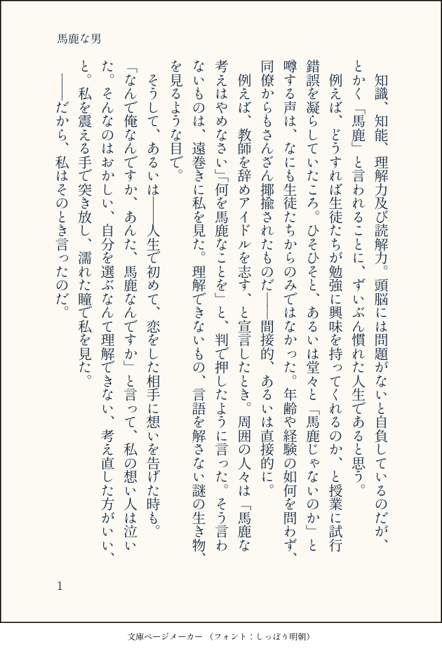 梅春和歌☆quiet followDONE『馬鹿な男』(硲山)頭はいいのに「馬鹿」な、硲道夫という男の話。硲さんって、(一定の)恥も外聞もあまり気にしない人だなあ、と思っています。どう見られるか、よりも、何を見せるか、何を残すか、何を伝えられるか、みたいな。すごく実用の人じゃないかな、というイメージで。そういう強さを持った硲道夫という人が好きです。あと、次郎ちゃんに「はざまさんのばか」って言ってほしかった。 #硲山 hazayama show all(+3 images) Tap to full screen (size:630x928).Repost is prohibited Let's send reactions! freqpopularsnackothersPayment processing Replies from the creator Follow creator you care about!☆quiet follow 梅春和歌DONE『ずうっといっしょ!』(🦇×🐺)タイトルと着想は某曲から。🦇さんが🐺さんの髪の毛を乾かすだけの話。離れてしまったあとで消えない傷になりたいと願うのと、何があっても離さないから傷になどしないと勝手に誓うの、どっちが重くて湿度高いんだろうね〜〜と思いながら書きました。🦇さんに湿度高く重くあってほしい気持ちが滲み出ている気がします。🐺さんが本当になにも知らないのかは、ご想像におまかせ。 8 梅春和歌DOODLE『きみはカフェインレス』(🦇×🐺)付き合ってる時空の、特になんでもない2人の夜。コーヒーを飲もうとする🐺さんと、それにストップを掛ける🦇さんの短い話です。 6 梅春和歌DOODLE『満たして欲望、愛して支配』(硲山)ふぃふす展のビジュアルがやばすぎて気が付いたら書き上がっていました。パッションだけで書いたのでだいぶ荒いです。はざやまの体格差と顔立ちの差がとんでもねえというだけの話。解釈もくそもないです。ぬるいけどスケベしてるのでR-18。🗝:18↑? y/n 8 梅春和歌DONEウルトラヒロイックHO2をやってる男が片っ端から刺さるオブザイヤー2024だったので、カッとなって描きました。みんな大好き。⚠️2枚め以降はネタバレもちょっとありの好きなとこ語り。ウルトラヒロイックの以下セッションの軽いネタバレを含みますのでご注意ください。・馬天道場ヒロイック・きてどちヒロイック・煩悩ヒロイック・すしぜむヒロイック・おきくらヒロイック 7 梅春和歌DONE『ルビンの首輪』(🦇×🐺)まだ付き合ってない🦇(→)(←)🐺にうっかり首を突っ込んだ👊ちゃんが、ふたりのド重感情に伴う人外的ムーブに振り回される話。⚠️🐺さんのチョーカーと、🦇さんの生家と、吸血鬼及び狼男の生態について、もりもり捏造しました。この話ではそういうもんなんだな……と思ってください。なんならもうパラレルワールドだと思っていただけると助かります。 11 梅春和歌DONE『其の口は愛で開く』(🦇×🐺)ゆるくてほんのりあまい、お茶の時間の話。×というか、どちらかというと🦇→→🐺。🦇さんが料理上手なのと、どちらかといえばしてあげたがりなのが好きです。尽くすタイプというか。🦇さんからの愛情を享受することに慣れている🐺さんも好きです。でも決してもらうばかりではない🐺さんも好き。なんだかそういう話です。 12 related works 梅春和歌DONE『とっておきの唄』硲山硲さんに、好きな人いるの?って聞く次郎ちゃんの話。共に生きてゆくことを選んだ、ちょっとだけ未来のふたりのはなしです。イメージ的には5〜10年くらいの間。年取ったりとかそういう描写がちょっとだけあるので、苦手な方はお気をつけて。 8 suzukakenDOODLEペーストでアップロードできんじゃーん!(昨日気づきました)よき。硲山。アニメのEDで硲が次郎背負って階段上がってた(トレーニング)ときに「そうか体力…!」って思いつつしぬほど萌えたんだけど、ちょいちょいデカイ次郎をこともなげにひょいって持ち上げて運んで欲しい。たぶんなんかゴネたか迷ったかしたんでしょ、次郎が(適当 suzukakenDOODLE硲山。最近描いてなかったので(シブにまとめられる量がなかった)おめー硲山描いたと思ったらだいたいこんな感じのばっかり描いてんな?しってるー。身長差とか体格とかモノともせずにぐいぐい押して欲しいんですよ硲には。硲のほうがDa値とか体力が上なのいいよね~5話のEDで次郎をおぶって階段登ってて、硲やべえな…って思ったりしたよステくんの衣装いいよね。もうひとりきてほしい… jakoooooooonDONE出来心ですすみません suzukakenDONE下書きだけしてたの発掘した。硲山。寝不足が続いた硲は事務所でポンコツになっててほしい。 suzukakenDOODLEどうしても死んでしまう山下次郎の話。続くよ大昔に書いたネームの一部掘り返し。細かいところは描かない。硲山になるやつ。 2 suzukakenDONE硲山。 suzukakenDONE今回のイベント、ずっとこう思って次郎のとこ歩いてる。 2 suzukakenDOODLEロジヴァン様とカラフルゾンビを描きたい季節になりましたね(???) recommended works suzukakenDONE硲山。シブでちょっと話した「あいつらは養子縁組したらいいのでは」っていう妄想を発作的にメモ。反省はしていない。てか次郎の設定次第なところあるんだけど、両親のなくし方次第ではこれじゃ足りないから設定で