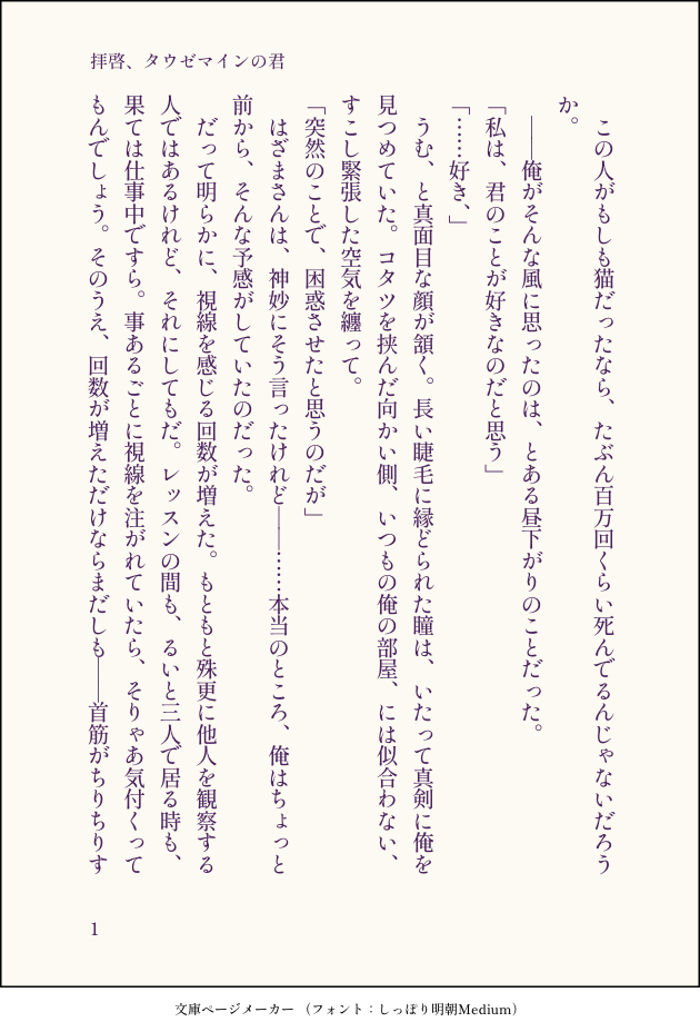 梅春和歌☆quiet followDONE『拝啓、タウゼマインの君』(硲山/7P)恋≒好奇心、な硲さんの話。硲さんの、知識欲が深いところが好きです。それが次郎ちゃんに向かう瞬間はもっと好きです。もしかしたら、こういう始まりのふたりもいるんじゃないかな、というハナシ。喰らいつくような恋愛をする硲山も、たまにはいいんじゃないかなと思いました。 #硲山 hazayama show all(+6 images) Tap to full screen (size:630x928).Repost is prohibited Let's send reactions! freqpopularsnackothersPayment processing Replies from the creator Follow creator you care about!☆quiet follow 梅春和歌DONE『ずうっといっしょ!』(🦇×🐺)タイトルと着想は某曲から。🦇さんが🐺さんの髪の毛を乾かすだけの話。離れてしまったあとで消えない傷になりたいと願うのと、何があっても離さないから傷になどしないと勝手に誓うの、どっちが重くて湿度高いんだろうね〜〜と思いながら書きました。🦇さんに湿度高く重くあってほしい気持ちが滲み出ている気がします。🐺さんが本当になにも知らないのかは、ご想像におまかせ。 8 梅春和歌DOODLE『きみはカフェインレス』(🦇×🐺)付き合ってる時空の、特になんでもない2人の夜。コーヒーを飲もうとする🐺さんと、それにストップを掛ける🦇さんの短い話です。 6 梅春和歌DOODLE『満たして欲望、愛して支配』(硲山)ふぃふす展のビジュアルがやばすぎて気が付いたら書き上がっていました。パッションだけで書いたのでだいぶ荒いです。はざやまの体格差と顔立ちの差がとんでもねえというだけの話。解釈もくそもないです。ぬるいけどスケベしてるのでR-18。🗝:18↑? y/n 8 梅春和歌DONEウルトラヒロイックHO2をやってる男が片っ端から刺さるオブザイヤー2024だったので、カッとなって描きました。みんな大好き。⚠️2枚め以降はネタバレもちょっとありの好きなとこ語り。ウルトラヒロイックの以下セッションの軽いネタバレを含みますのでご注意ください。・馬天道場ヒロイック・きてどちヒロイック・煩悩ヒロイック・すしぜむヒロイック・おきくらヒロイック 7 梅春和歌DONE『ルビンの首輪』(🦇×🐺)まだ付き合ってない🦇(→)(←)🐺にうっかり首を突っ込んだ👊ちゃんが、ふたりのド重感情に伴う人外的ムーブに振り回される話。⚠️🐺さんのチョーカーと、🦇さんの生家と、吸血鬼及び狼男の生態について、もりもり捏造しました。この話ではそういうもんなんだな……と思ってください。なんならもうパラレルワールドだと思っていただけると助かります。 11 梅春和歌DONE『其の口は愛で開く』(🦇×🐺)ゆるくてほんのりあまい、お茶の時間の話。×というか、どちらかというと🦇→→🐺。🦇さんが料理上手なのと、どちらかといえばしてあげたがりなのが好きです。尽くすタイプというか。🦇さんからの愛情を享受することに慣れている🐺さんも好きです。でも決してもらうばかりではない🐺さんも好き。なんだかそういう話です。 12 related works suzukakenDONE今回のイベント、ずっとこう思って次郎のとこ歩いてる。 2 suzukakenDONE下書きだけしてたの発掘した。硲山。寝不足が続いた硲は事務所でポンコツになっててほしい。 suzukakenDONE硲山。 suzukakenDOODLEどうしても死んでしまう山下次郎の話。続くよ大昔に書いたネームの一部掘り返し。細かいところは描かない。硲山になるやつ。 2 梅春和歌DONE『とっておきの唄』硲山硲さんに、好きな人いるの?って聞く次郎ちゃんの話。共に生きてゆくことを選んだ、ちょっとだけ未来のふたりのはなしです。イメージ的には5〜10年くらいの間。年取ったりとかそういう描写がちょっとだけあるので、苦手な方はお気をつけて。 8 jakoooooooonDONE出来心ですすみません suzukakenDOODLEロジヴァン様とカラフルゾンビを描きたい季節になりましたね(???) suzukakenDOODLE硲山。最近描いてなかったので(シブにまとめられる量がなかった)おめー硲山描いたと思ったらだいたいこんな感じのばっかり描いてんな?しってるー。身長差とか体格とかモノともせずにぐいぐい押して欲しいんですよ硲には。硲のほうがDa値とか体力が上なのいいよね~5話のEDで次郎をおぶって階段登ってて、硲やべえな…って思ったりしたよステくんの衣装いいよね。もうひとりきてほしい… suzukakenDOODLEペーストでアップロードできんじゃーん!(昨日気づきました)よき。硲山。アニメのEDで硲が次郎背負って階段上がってた(トレーニング)ときに「そうか体力…!」って思いつつしぬほど萌えたんだけど、ちょいちょいデカイ次郎をこともなげにひょいって持ち上げて運んで欲しい。たぶんなんかゴネたか迷ったかしたんでしょ、次郎が(適当 recommended works 梅春和歌DONE『献煙』(硲山)※注※硲さんの喫煙描写、家族関係捏造があります煙草を吸う硲さんと、それにびっくりする次郎ちゃんの話。硲さんはいい歳の取り方をするとおもいます。 4 suzukakenDOODLE着地点が見つからなくなった硲山のらくがき suzukakenDONE下書きだけしてたの発掘した。硲山。寝不足が続いた硲