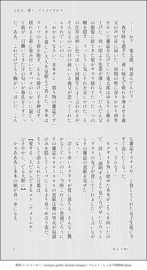 yama_08_11☆quiet followDOODLE #ゲタ水版ワンドロワンライお題【アメとムチ 】大丈夫。僕ァ、イイ子ですかラがっつり付き合ってる〓💧〓高校生💧オジサン友達の女子生徒がS◯特集組んでた雑誌◯n-◯nを貸してくれたが、そーゆー気分にならないゲタ吉くんの話 #ゲ謎 #ゲタ水 #ゲタ水版ワンドロワンライ #鬼水 show all(+5 images) Tap to full screen (size:618x1132).Repost is prohibited Let's send reactions! freqpopularsnackothersPayment processing Replies from the creator Follow creator you care about!☆quiet follow yama_08_11PROGRESS3/31インテHARU COMIC CITY 33で出す予定のサンプルです。水木の死を機に思いが爆発した鬼太郎が、水木の人形を作って魂を閉じ込め水木を全部ものにしてしまう話です。部数アンケートにお答えください。→https://forms.gle/2kg1MHSQpoKtsx7Q8ネタ元→https://poipiku.com/9317760/9776346.html18↑(y/n) 17795 yama_08_11DOODLE #ゲタ水版ワンドロワンライお題【アメとムチ 】大丈夫。僕ァ、イイ子ですかラがっつり付き合ってる〓💧〓高校生💧オジサン友達の女子生徒がS◯特集組んでた雑誌◯n-◯nを貸してくれたが、そーゆー気分にならないゲタ吉くんの話 6 yama_08_11DONE連れてゆこう どこまでも鬼太郎がお母さんの腹の中にいる時の話です。入村するたびにちゃんちゃんこのところで泣いてしまうので、自分のきもちを落ち着かせるために書きました。こうだったらいいな、の妄想の塊です。 10 yama_08_11DOODLE #ゲタ水版ワンドロワンライ 第9回目【2月14日は、①バレンタインデー】何色でもWelcomeです付き合ってる〓水〓高校生💧50弱毎回延長……長くてすみません。怨念入りチョコと言うよくある話です。何色でもWelcomeです 9 yama_08_11DOODLE手をつなごう死ネタ。ばんぷの「話がしたいよ」をラジオで昨日聞いて、なんかこれ、水木死んで残された鬼太郎が成長したゲタ吉じゃね?って思ったままのかいた妄想。ほぼ曲まま。良かったら聞いてみてくださいイイ曲なので。水木の墓参りをするためにバス停で待ってるだけのゲタ吉君です。 4 yama_08_11DOODLE #ゲタ水版ワンドロワンライお題【おねだり/反省】……ヒドい人延長戦してしまいワンライじゃなくなってすみません。付き合ってる〓💧ほとんどが💧の独白。最後ちょっぴり大人的な。前回【家庭訪問】……嘘はつかないのうっすら続きっぽくなりましたが、前回の話読んでなくても大丈夫です。 9 related works ユカリコDOODLE入村記念これから増やしていけたらいいな。 3 あね犬ane_kenDOODLE【水木家は鬼太郎の事になるとツッコミ不在になります】2人ともキタちゃんギャンかわしゅきしゅき勢なので何してもこうなるんじゃないかなーという妄想。ちゃんちゃんこと下駄何とかしなさいよw(どこに着ければええんか分からんくなったんやスマン)#ゲ謎 #ゲゲゲの鬼太郎 #ゲゲ郎 #水木#鬼太郎 抹茶🍵DOODLEイチャイチャしてる2人にドヤ顔された。 あね犬ane_kenDONE【例のアレ】撃ったあと髪をかきあげると見える人(?)には見えちゃうww#ゲ謎 #ゴールデンカムイ #クロスオーバー #ゲゲ郎 #水木 #尾形 yama_08_11DONE連れてゆこう どこまでも鬼太郎がお母さんの腹の中にいる時の話です。入村するたびにちゃんちゃんこのところで泣いてしまうので、自分のきもちを落ち着かせるために書きました。こうだったらいいな、の妄想の塊です。 10 ゆきぽDOODLE配信記念(再掲) wai_y_kakuriDOODLE現代版ピュア子ゲゲと水木(謎時空)ハロウィンまんが+α 10 bkhare9610DOODLEまとめたの。時系列ごちゃ混ぜです。 28 aren1510PROGRESS10月目水父水🔞新刊に入るかもしれない話です!かもというよりなんかいい感じに書けたので入れると思います!😅パス→18歳以上?(y/n)初めてパス付けたので不備あったらすみません💦 6971 recommended works calmdeath_lotusDOODLEガイアさんの死ネタです 旅人が全部解決した世界線 とんでもなく短いけどフォロワーの供給のために出します 書き足すかな 多分しないね 745 hathiovoSPUR MEジニクラ長編⑤※注意終末期に向けて進む話少しずつこうちょが壊れていく話認知症になるよしゅけべも出て来るジニクラオメガバース六万文字軽く凌駕するここに載せて色々バランスや誤字確認したのちpixivに纏める予定 9368 hathiovoSPUR MEジニクラ長編⑨※注意終末期に向けて進む話少しずつこうちょが壊れていく話認知症になるよしゅけべも出て来るジニクラオメガバース六万文字軽く凌駕するここに載せて色々バランスや誤字確認したのちpixivに纏める予定 10488 Khr5fIreSPOILERゲ日記 _Ria917DOODLEにょた化×ゲゲ郎×触手 shu_kakusaiDOODLE全身練習 nashireonnnDONE水木を自分たちの方に引っ張るために色々準備してたら他の妖怪に目をつけられて水木が襲われる話。親父も鬼太郎も間に合ってません。水木は普通に死んでる。そういう話です。ここからなんやかんやあってハッピーエンドに行くと思います。多分。鬼水メイン、父水エッセンス 3846 たまづきPROGRESS某狂夜街のパロディ色味を見るために本家様の色合いのままですがキャラ色に直したらシールとかアクキー考えてる ぼくぽちDOODLE最近描いたゲ謎の絵。