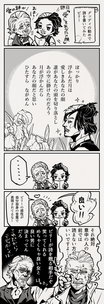 6_k111☆quiet followDOODLEグッディの勧めで初めて詩を書いてみたビリーの話。詩は映画『王になった男』から。(話を補足すると、初めて創作で自分を表現するビリーに「表現することは恥ずかしいことではない」「作るという行為を楽しんでほしい」という思いがあるグッディって感じ。) #マグニフィセント7 magnificent7 show all(+1 images) Tap to full screen (size:344x1000).Repost is prohibited Let's send reactions! freqpopularsnackothersPayment processing Replies from the creator Follow creator you care about!☆quiet follow 6_k111SPOILER14段外伝の雑渡さん素顔。外伝を観賞して以来、あの姿がずっと心に燻っています。 2 6_k111DOODLEグッディとビリー「ビリーが初めて満面の笑顔を見せた時、グッディはあまりの嬉しさに気の利いた冗談も言えずブサかわいい猫みてぇな声しか出せませんでした」 3 6_k111DOODLE🦑ゲーム イノジュノ「Valravn」北欧の伝承の化け鴉。王や酋長が戦死しても発見されずに埋葬されると、カラスがやってきて食べてしまう。王の心臓を食べたカラスは人間の知識を得て、大きな悪事を働くことができ、人々を迷わせ、超人的な力を持つ。別の説では、Valravnは夜に飛び、子供の血を飲み干すことによってのみ動物的な姿から解放される、贖罪を求めて彷徨う魂として描かれている。 6_k111DOODLEビョンホン氏とイーサン氏のツーショットをグッディとビリーにしました。2人の旅の思い出の様なイメージで。 6_k111DOODLE『ムーンナイト』スーツのマントを広げたとき三日月の形になるのがとても好きだ。最終話の夜空に飛び立つシーンが特に美しい。 6_k111DOODLEイカゲーム フロントマン。イノ兄さんの誕生日は2/2らしいそうで。猫の日だ!と勢いでお祝いの絵を猫風味にしたのだけど日本の猫の日は2/22だったんだ!そういう絵です、お誕生日おめでとう。 2 related works 6_k111DOODLEグッディとビリー。出会って間もない頃なのでビリーがまだ塩対応。 6_k111DOODLEグッディとビリー 中の方の出演作ネタ(戦友の服がルイジアナタイガースだったり、盟友の髪に簪が…等小ネタを入れました) 2 6_k111DOODLEグッディとビリー「ビリーが初めて満面の笑顔を見せた時、グッディはあまりの嬉しさに気の利いた冗談も言えずブサかわいい猫みてぇな声しか出せませんでした」 3 6_k111DOODLEグッディとビリー現パロ。コーヒー美味しいよねという話。 6_k111DOODLEグッディの勧めで初めて詩を書いてみたビリーの話。詩は映画『王になった男』から。(話を補足すると、初めて創作で自分を表現するビリーに「表現することは恥ずかしいことではない」「作るという行為を楽しんでほしい」という思いがあるグッディって感じ。) 2 6_k111DOODLEグッディとビリー グッディが「お互いもっとずっとはやく出会っていたら?」と想像する話。※死と流血の表現があります。グッディの想像は存在しない故郷に思い焦がれるみたいなもの。それに対して現実的な返答をするけど、お互いに出会えたことをどれだけ大切に思っているか真っ直ぐに伝えるビリー。どちらもお互いへの愛情。 2 6_k111DOODLEビョンホン氏とイーサン氏のツーショットをグッディとビリーにしました。2人の旅の思い出の様なイメージで。 6_k111DOODLE現パログッディとビリー、ゲースロを観る。イーサン・ホーク氏とピーター・ディンクレイジ氏が友人同士だということに滅茶苦茶ときめいた勢いで描きました。今回のグッディのヘアスタイルはタッカー・クロウ風。 2 6_k111DOODLEグッディとビリーの喧嘩 喧嘩中でも面白いと思ったものは褒める男「歳の数だけ雷に打たれて死んじまえ」は『グッド・バッド・ウィアード』のユン・テグの名言です。(ビリーは本気でも冗談でもグッディに死ねとは言わなそうと思ったので少し変えた)