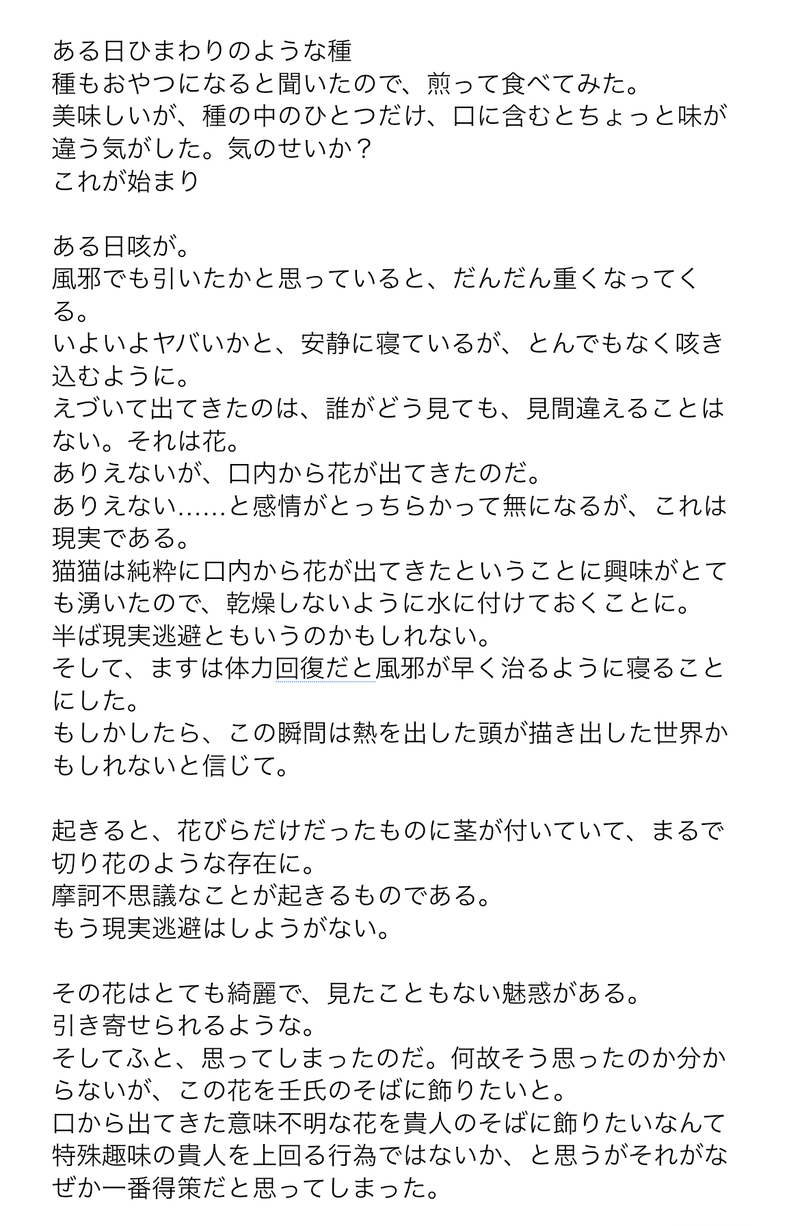 くららん@くすりや☆quiet followMEMOずっと書きたいと思ってる花吐き病のネタが、記憶ないんだけどそこそこ詰めてあった🌷結構結末まで書いてあったので、これだけじゃなくていくつかのパターンとか考えてみたい…🌸 ##ネタ候補 Tap to full screen (size:1170x1794).Repost is prohibited Let's send reactions! freqpopularsnackothersPayment processing Replies from the creator Follow creator you care about!☆quiet follow くららん@くすりやMOURNING勢いで書いた黒い会社に入ってしまった猫が、採用辞退しようとしたら、同じく黒い会社に出向して使命を持たされた壬くんに相棒になってくれと願われて…みたいな現パロ的社会人のふたりのはなし。勢いだけ、続きはたぶんない。人を選ぶかもしれないのでフォロ限ですいません。 1975 くららん@くすりやMEMO疲れたおたくの妄想。「祇園精舎の鐘の声」から始まる平家物語のあの冒頭の文面、盛者必衰・諸行無常をテーマにつらつらと。「たけき者も遂には滅びぬ」は壬氏にとって苦行のはずなのに、もしもその先にあってはならない希望を見出してしまったら…?という妄想。いつかしっかり書きたいので、フォロ限ですいません。 2 くららん@くすりやMEMO猫猫と水蓮のある会話から始まるお話。さっきまで夕餉を共にしていた壬氏は表情豊かだったと感じていたが——水蓮の話を聞くと、普段はそうでもないのだという。何かあったのだろうか、話を聞くうちに要が見えてきた猫猫はある方法で壬氏を【こてんぱん】にすることにしたのだった。続き書けたら書きたいので一旦フォロ限ですいません! 1798 くららん@くすりやMOURNINGつらつら思い浮かぶものを書いていたらやっぱり破綻してしまったもの。書きたいシーンの為に礎かためてたら迷子になっちゃった。逃避行的なイメージ。そして原作16巻以降のふたり。まじで破綻してるので、それでも構わないよぉって方だけ「かまへん」でお入りください〜 1290 くららん@くすりやMEMO壬氏と猫猫の婚姻が決まった。婚儀はまだ先としつつも、その前にある儀式に猫猫は参加する必要があると朕から言われて…みたいなお話。儀式ぽいもの×媚薬でお耽美を出せたらいいなぁって未来の私にネタだけ残していく。文のようでいて、プロットのようなところもあります。ご容赦を☺️全年齢だけど、ちょっと大人ぽい雰囲気はあるかも 1577 くららん@くすりやMEMO櫛を通して皇弟夫婦の絆が深くなっていくといいなぁとつらつら書いたプロットみたいな文章。時間を見つけられたらかたちにしたいな。 1719 recommended works komehazesukiMOURNINGアルジュナくんが描けない 柚蜜@ゆいかPROGRESSワンノートってスマホからだと全部みるのたいへんだからきづかなかったけど、皇帝と白澤様と鬼様のネタの下の方に男は引きずるから駄目って言ってるネタかいてあったわでも皇帝の話はこのエピソード入れないで終わらせた方がいいよなぁと思うんだ・・昔告白して振られてる設定は残したいけど、かつて本気になった男の生まれ変わりが鬼様ってところはちょっと流れが悪い感じがするし。余計かな。メイン、山場は別のとこ 2 10♦︎PASTポケモン、ゼルダ。 3 gargantuapocketREHABILIハロウィン風アイコン……になればよかったな?な感じの残骸。こんなんでも使いたい方がいらっしゃいましたらご自由にどうぞ。クレジット、使用報告等は要りませんが自作発言は禁止です。 5 こうみMOURNING遊覧船 あさ瀬DOODLEショタzhと叶と🐖さん#供養 soh0xxPROGRESSということで3月に出すエーデュース本のプロットデータ化作業完了〜。この段階で10178字。ここからさらに肉付けしまくってから書くのでどんくらいになるんだろうか……。 こうみMOURNING僕を大事にしてくれるのなら、明日もおんなじキスをして。 6 momioro_with_ngMOURNINGRing.A.Bell間に合わなかった漫画の一コマ。もはやどんな漫画を描こうとしてたのか覚えてな…明日見る😌💦