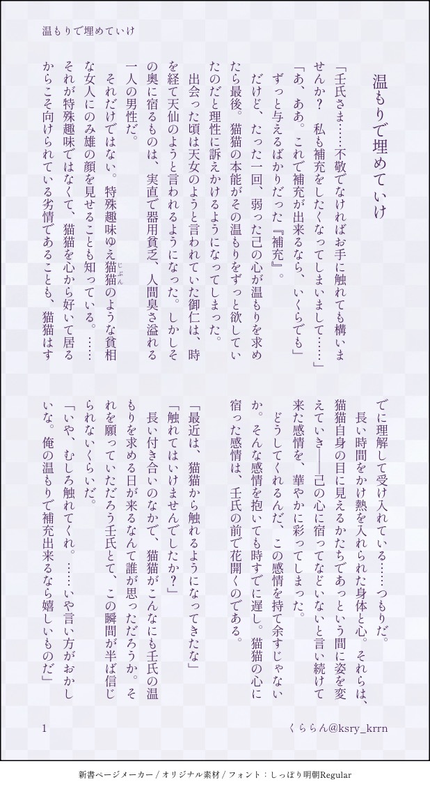 くららん@くすりや☆quiet followDONE7/21のネタ。16巻以降の壬猫ちゃんの関係性。0721の表現としつつも、私なのでそんなに濃い描写は書けません😂気持ちR15程度。後ほど支部にもアップします〜合言葉は『はい』を英語で。 show hide show all(+5 images) Tap to full screen (size:618x1132).Repost is prohibited Let's send reactions! freqpopularsnackothersPayment processing Replies from the creator Follow creator you care about!☆quiet follow くららん@くすりやMOURNING勢いで書いた黒い会社に入ってしまった猫が、採用辞退しようとしたら、同じく黒い会社に出向して使命を持たされた壬くんに相棒になってくれと願われて…みたいな現パロ的社会人のふたりのはなし。勢いだけ、続きはたぶんない。人を選ぶかもしれないのでフォロ限ですいません。 1975 くららん@くすりやMEMO疲れたおたくの妄想。「祇園精舎の鐘の声」から始まる平家物語のあの冒頭の文面、盛者必衰・諸行無常をテーマにつらつらと。「たけき者も遂には滅びぬ」は壬氏にとって苦行のはずなのに、もしもその先にあってはならない希望を見出してしまったら…?という妄想。いつかしっかり書きたいので、フォロ限ですいません。 2 くららん@くすりやMEMO猫猫と水蓮のある会話から始まるお話。さっきまで夕餉を共にしていた壬氏は表情豊かだったと感じていたが——水蓮の話を聞くと、普段はそうでもないのだという。何かあったのだろうか、話を聞くうちに要が見えてきた猫猫はある方法で壬氏を【こてんぱん】にすることにしたのだった。続き書けたら書きたいので一旦フォロ限ですいません! 1798 くららん@くすりやMOURNINGつらつら思い浮かぶものを書いていたらやっぱり破綻してしまったもの。書きたいシーンの為に礎かためてたら迷子になっちゃった。逃避行的なイメージ。そして原作16巻以降のふたり。まじで破綻してるので、それでも構わないよぉって方だけ「かまへん」でお入りください〜 1290 くららん@くすりやMEMO壬氏と猫猫の婚姻が決まった。婚儀はまだ先としつつも、その前にある儀式に猫猫は参加する必要があると朕から言われて…みたいなお話。儀式ぽいもの×媚薬でお耽美を出せたらいいなぁって未来の私にネタだけ残していく。文のようでいて、プロットのようなところもあります。ご容赦を☺️全年齢だけど、ちょっと大人ぽい雰囲気はあるかも 1577 くららん@くすりやMEMO櫛を通して皇弟夫婦の絆が深くなっていくといいなぁとつらつら書いたプロットみたいな文章。時間を見つけられたらかたちにしたいな。 1719