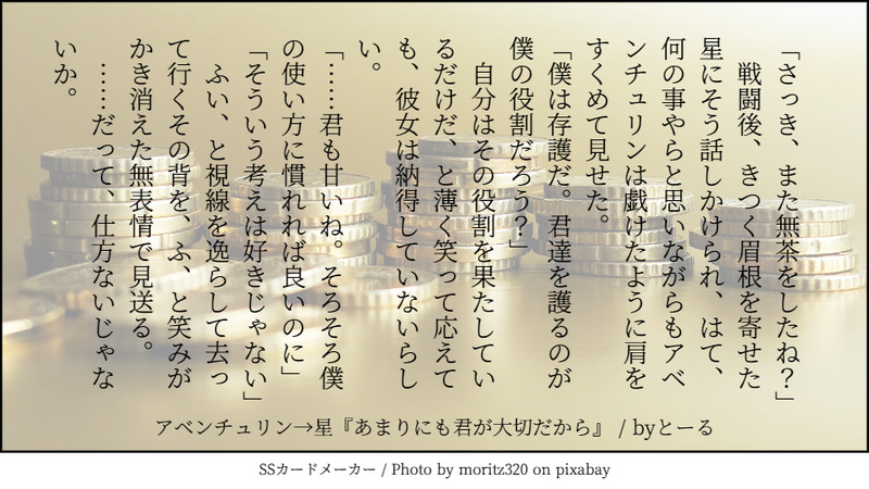 wisteria069☆quiet followPASTアベンチュリン→星へのお題は『あまりにも君が大切だから』「君の命に、僕が賭けられるものは《僕自身(コレ)》しかないんだから……」 #崩壊スターレイル Honkai: Star Rail #アベンチュリン(崩壊スターレイル) Aventurine (Honkai: Star Rail) #星(崩壊スターレイル) #アベ星 Avenstelle Tap to full screen (size:960x540).Repost is prohibited Let's send reactions! freqpopularsnackothersPayment processing Replies from the creator Follow creator you care about!☆quiet follow wisteria069PAST5.7予告番組を見て、こういうのが真っ先に過ぎりました…+師匠大好き手合わせやりた過ぎて最後まで話聞かない弟子ととことんマイペースな師匠。。。w【お借りした物】(敬称略)武器:阿波卡利エフェクト:そぼろ 2 wisteria069PAST初出:2024/10/15「―――…捕まえた」 wisteria069PAST初出:2024/09/29タルさんはなんか、キスの時目を閉じないイメージが……+ wisteria069PAST初出:2024/08/28タル式、と言うかタルさんにしかできない「警戒心の強い猫の手懐け方」「ね、簡単でしょ?」 wisteria069DONE暗殺者タル友人達が、タルさんの・現パロの服装が見たい・グラサンかけてるのが見たい・煙草吸ってるのが見たいという欲張りセットをご要望でしたので、取りあえず全部まるっといっきに詰め込んでみました。【お借りしたもの】(敬称略)モデル:miHoYo/观海/1yaアクセサリ:アサシンP/Jasper Carmack/時の番人/じぇんしあエフェクト:そぼろ/less/暴風P 8 wisteria069DONE猫様と撮影中?友人に「a○anの表紙みたい」と言わしめた邪タル公子様。ついでに、撮影の合間に愛猫と休憩をされている風景みたいなものを添えて。【お借りしたもの】(敬称略)ベッド:白楽猫:むよむよエフェクト:そぼろ/less/暴風P 9 related works せんぽーDONEアベ星🦚🌟 学パロ続きルート1 第13話大学編開始。🦚🌟が💫ホタと再会するお話 3570 せんぽーDONEアベ星🦚🌟 学パロ続きルート1 第15話🦚を守るため覚醒する🌟ちゃんのお話 3747 せんぽーDONE純粋な星ちゃんが警官アベンチュリンにまんまと嵌められてしまうお話。 ※注意 2.1verのネタバレあり。若干🦚さんにヤンデレ感があります。 4564 boisDONEなお、真理のリンゴは商品にもなります()CPなし、なんでも笑って許せる方向け。 franchinaraDOODLE🦚 Aventurine!アベンチュリン🔑= ↑18 ? Y/N boisDONE「When A of Spades turns into...」まったく間に合わなかったハートの日(8/10)のラクガキ。 2 せんぽーDONEアベ星🦚🌟 学パロ続きルート1 第14話人前で惚気話をする🦚に照れて蒸発しちゃう🌟ちゃんのお話 2773 下原月DONEメイドはいかがでしょうか 2 せんぽーDONEアベ星🦚🌟🔞 朝えっち寝ている🌟ちゃんが何度も自分の名前を呼ぶので、我慢できずに襲っちゃう🦚pw:18↑? yes/no 2 recommended works マサキ=ナナヤDONE競泳水着北斗 PeiaPROGRESS アカメDOODLEショウくん そう3DONE鍾離のアクスタを作ります!グッズ初めて作るからドキドキだ猫耳チャイナという好きなものよくばりセット LOW*ろわMAIKING没ガイア そう3DONE岩神***ウェンティの絵とシリーズになるように描いたよ~ __marumaroDOODLE⚠️女体注意!⚠️ちょっとえっちな♀にょた🔥ディルック もみじDONEクレーちゃん ichi10_gmPAST
