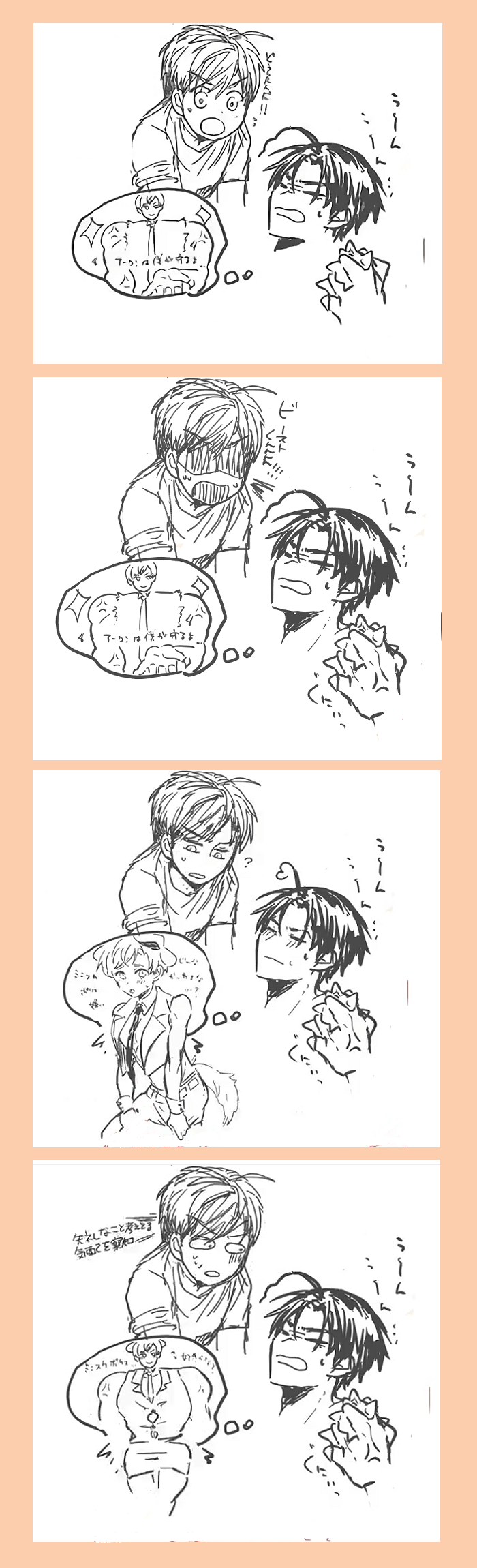 あおみ☆quiet followDONEはっしゅさんのところの絵チャにお邪魔した時の、5キロさんとのアロルク劇場ログです。(ルク:わたし アロ:5キロさん)爆速で描き換えられていたので、ここに納まっていない(スクショにも動画にもログが存在しない)表情がたくさんあります…( ˘ω˘ ) show all(+4 images) Tap to full screen (size:700x2300).Repost is prohibited Let's send reactions! freqpopularsnackothersPayment processing Replies from the creator Follow creator you care about!☆quiet follow あおみDOODLE自分まだ夏休みやれますパス:ア誕 2 あおみDONE猫三さんリクエスト「えっ、寝ないのか?」PASS ア誕 2 あおみDONE # フォロワーさんからもらった台詞で一コマ描く「オアズケだ」待ては覚えてない犬 2 あおみINFO2024/06/30(日)光を分かつ相棒 JB2024【東8ホール 東パ56b】ギリギリでなんとか本が出来ました。新刊「DOGS MUST BE LEASHED」のサンプルです。アロルク要素は最後にちょっとだけ。 9 あおみDOODLE🐳描いたことなかったなっておもって…アロルクPASS:誕生日4桁 2 あおみSPOILER暮らドメのらくがき ヒィヒィ…… recommended works cokoDONEバディミッションクリアした!楽しかった! かげるREHABILI【アロルク】同類ヒーロー性仮説【お題】似た者同士#アロルク版深夜の創作60分一本勝負 4 NEIA_AINEDONE #アロルク版深夜の創作60分一本勝負【アロルク】28分遅刻しました!すみませんでして!借りたお題は「お酒」の方で、単にアルコール代わりにお酒を吹くアーロンが書きたかっただけ。なお医療行為としては効果はあるけど、正しくはない、みたいな感じらしいし、私自身は医者じゃないので、あくまでファンタジー的に読んでください。あと運営様、お疲れ様でした!最後までよろしくお願いします! 失敗した。その一言に尽きる。 「クソッタレ!おいルーク、大丈夫か!」 「だ、大丈夫だ」 あまりの激痛に顔が引き攣る。この状態では銃を握ることすらできない。どう考えても戦力外状態だ。痛みが思考の邪魔をする。ただ僕が負傷した現状が、非常にマズイことだけは明白だった。 時は数日前に遡る。 「「Discardに関する資料が持ち去られたぁ!?」」 僕と相棒のアーロンはナデシコさんの一声でミカグラ島の警察本部、警視総監室にいた。 「正確に言うと、ハスマリー研究の資料が持ち去られた、だ」 ナデシコさんはいつもの落ち着いた雰囲気からガラリと表情を変え、かなりピリついた態度だった。それだけにこの話の緊急性がうかがえる。 「今我々が組織の抜本的な改革をしていることは君たちも知っての通りだが、その過程で出てきた資料はすべて紙ベースにした上で資料課が管理をしている。しかし、そこの新人がうっかり鍵を閉め忘れたらしくな。何者かの侵入を許した上に、最重要機密扱いの資料たちを盗んだようなのだ」 眉間に手を当て、困り果てた顔のナデシコさん。かの研究の悲しくも恐ろしい部分の一端を垣間見てきた彼女だ 3134 mzzzkkkDONE『闇を駆ける』ワンドロ投稿作品です。相方の武器を使うのはロマンです!!!!一応初期アロルクの設定で書いてます。(あんまりそれ感無いですが) 5 yuenbondDONEhttps://poipiku.com/2576837/4460732.html先日のアロルクワンドロ(↑)のアーロン視点。書いてあったの完全に忘れておりましたので今更ですがアップしておきます。 6 nugarisDOODLEルークとアーロン 蒼夜海里DOODLE #アロルク深夜のワンドロワンライ祭り お題「身長差」+20m ねころびDONEグルメバディのルークとモクマさん2人でいっぱい美味しいもの食べてくれればこちらはそれだけでお腹いっぱいです...※画力不足で南蛮漬けが描けず、ただの焼き魚になりました...あとつみれ汁が雑...いずれ描き直そう...! U_inspiritDONE22/2/12開催「ロード・トゥ・ザ・ヒーロー!2」展示その2バレンタインなのに恋人へのプレゼントの用意をすっかり忘れていたルークの話全年齢/14p 15