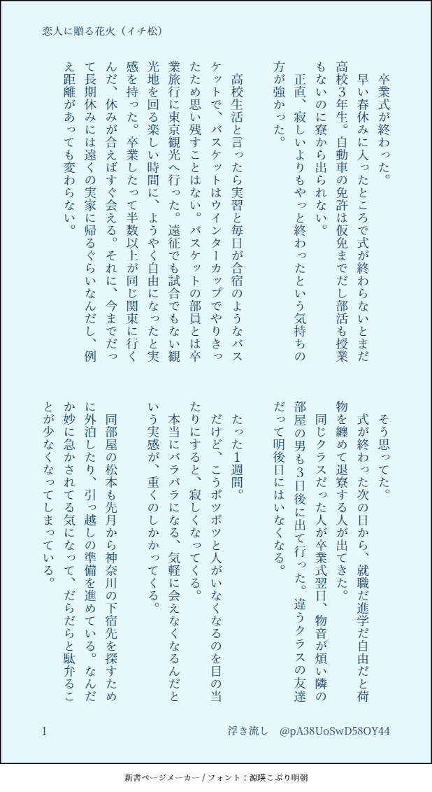 浮き流し☆quiet followDONE両片思いイチ松卒業式後離れ離れを実感して告白を決める話エール花火とメッセージに感動したので。 #イチ松 show all(+6 images) Tap to full screen (size:618x1132).Repost is prohibited Let's send reactions! freqpopularsnackothersPayment processing Replies from the creator Follow creator you care about!☆quiet follow 浮き流しDONEイチ松成立済寒い中カーテンに包まれてほしかったもの 4 浮き流しDONEイチ松ワンドロライより11月のお題 赤 3 浮き流しDONEイチ松ワンドロライより9月のお題2つ(体育祭・秋桜) 8 浮き流しDOODLEさわまつ 浮き流しDONEイチ松松と電話にまつわるお話(学生・社会人軸)携帯がない時代がもう考えられないです 7 浮き流しDONEドライブするイチ松運転手イチと助手席松 大学生 5 related works (´◉౪◉`)DONE松絵は複製が容易だった件##松 7 shiro_snohDOODLEいちまつにょたにょたOKですか?y/n sktm1311DOODLE大学生 イチ松④③https://poipiku.com/492586/9153488.htmlのつづき 12 浮き流しDONEイチ松ワンドロライより11月のお題 赤 3 sktm1311DOODLE大学生 イチ松③①https://poipiku.com/492586/8990618.html② https://poipiku.com/492586/9018721.html次会う時(⛹️🏀では会うけど)とは言ってもそれはなかなか難しい環境のふたりに、おでかけして欲しくて その辺りだけ描いたので分かりにくいです……バスケのあとは着替えた(分かりにくい) 18 sktm1311DOODLE大学生 イチ松⑤https://poipiku.com/492586/9361968.htmlのつづき 18 sktm1311DOODLEイチ松 また名前……最後にあるらくがきからイチ松はボーイミーツボーイ的な雰囲気(謎)であってほしいこの2人はぬきあいすらしてない……ちょっといじわるしたくなったイチノ卒業しても意外としない(言われたしちょっと試したり、ならしたりをちゃんとしてる松本(大学生)でもしないなら今すぐしないでもと思ってる、でも言われたからってちゃんと頑張ってみてる松本(大学生)) 15 onisan75DOODLE8/6だろ?イチ松の日なんだろ???何もでてないけど、一応ね?18↑?(yes or no) 5 onisan75SPUR MEイチ松🔞もう1ページ描くとか言ってたけど全然終わらないから先に描き終わってたやつ出すね(y/n)