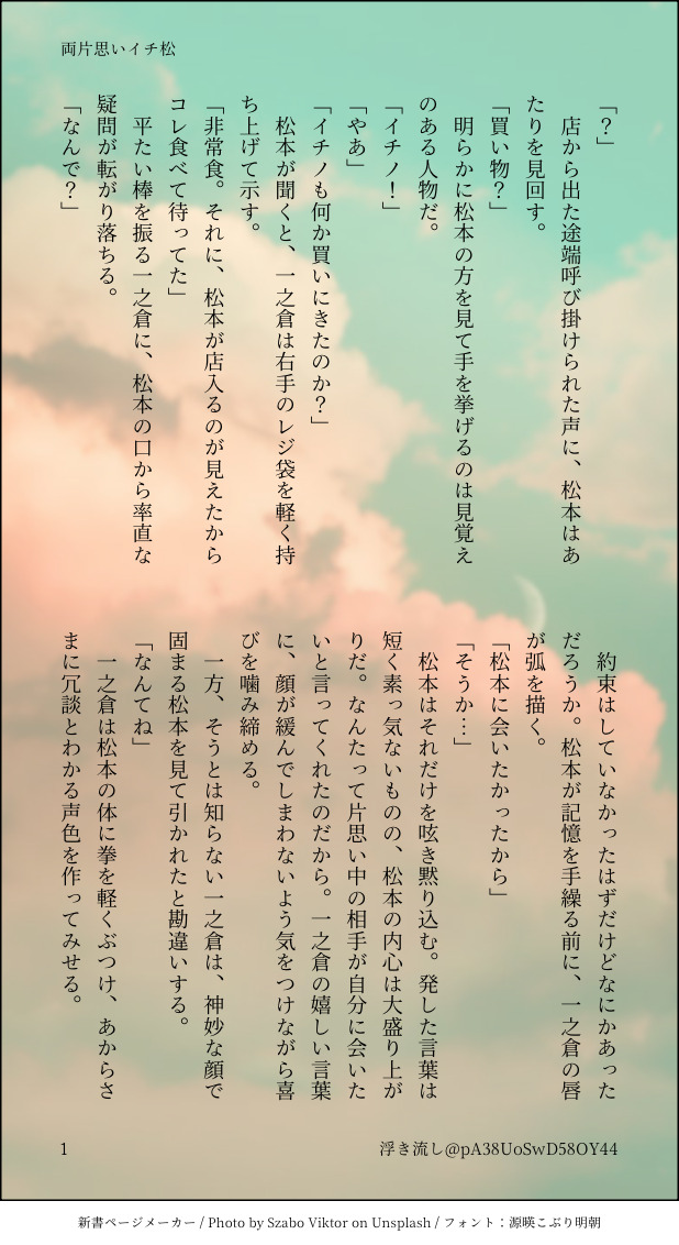 浮き流し☆quiet followDONE会いたいのは本当だから。両片思いイチ松 #イチ松 show all(+2 images) Tap to full screen (size:618x1132).Repost is prohibited Let's send reactions! freqpopularsnackothersPayment processing Replies from the creator Follow creator you care about!☆quiet follow 浮き流しDONE会いたいのは本当だから。両片思いイチ松 3 浮き流しDONEイチ松成立済寒い中カーテンに包まれてほしかったもの 4 浮き流しDONEイチ松ワンドロライより11月のお題 赤 3 浮き流しDONEイチ松ワンドロライより9月のお題2つ(体育祭・秋桜) 8 浮き流しDOODLEさわまつ 浮き流しDONEイチ松松と電話にまつわるお話(学生・社会人軸)携帯がない時代がもう考えられないです 7 related works sktm1311DOODLE大学生 イチ松⑤https://poipiku.com/492586/9361968.htmlのつづき 18 shiro_snohDOODLEいちまつにょたにょたOKですか?y/n onisan75SPUR MEイチ松🔞もう1ページ描くとか言ってたけど全然終わらないから先に描き終わってたやつ出すね(y/n) onisan75DOODLE8/6だろ?イチ松の日なんだろ???何もでてないけど、一応ね?18↑?(yes or no) 5 (´◉౪◉`)DONE松絵は複製が容易だった件##松 7 sktm1311DOODLE大学生 イチ松③①https://poipiku.com/492586/8990618.html② https://poipiku.com/492586/9018721.html次会う時(⛹️🏀では会うけど)とは言ってもそれはなかなか難しい環境のふたりに、おでかけして欲しくて その辺りだけ描いたので分かりにくいです……バスケのあとは着替えた(分かりにくい) 18 sktm1311DOODLE大学生 イチ松④③https://poipiku.com/492586/9153488.htmlのつづき 12 sktm1311DOODLEイチ松 また名前……最後にあるらくがきからイチ松はボーイミーツボーイ的な雰囲気(謎)であってほしいこの2人はぬきあいすらしてない……ちょっといじわるしたくなったイチノ卒業しても意外としない(言われたしちょっと試したり、ならしたりをちゃんとしてる松本(大学生)でもしないなら今すぐしないでもと思ってる、でも言われたからってちゃんと頑張ってみてる松本(大学生)) 15 浮き流しDONEイチ松ワンドロライより11月のお題 赤 3