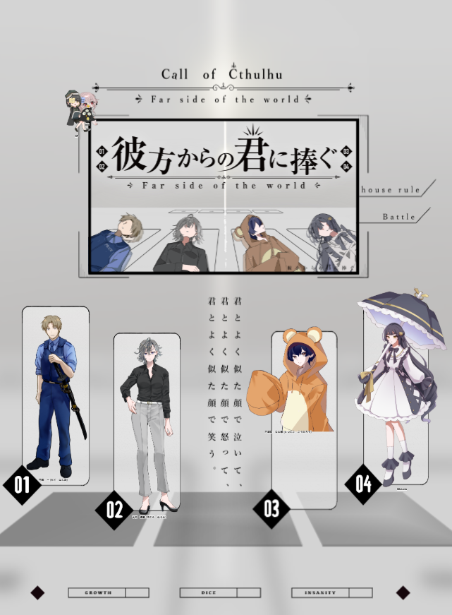 梅シロップ☆quiet followMEMOcoc『彼方からの君に捧ぐ』KP:しまSKP:櫛茶PC1:門廻 一 / 梅シロップPC2:木村 優華 / hennlyPC3:戸津常 公太郎 / ひらめPC4:Wisteria / 惺乃生敬称略END-12025.07.06 ##卓報告 Tap to full screen (size:641x871).Repost is prohibited Let's send reactions! freqpopularsnackothersPayment processing Replies from the creator Follow creator you care about!☆quiet follow 梅シロップMEMOcoc『白壁の傀』KP:あきわHO1:比良坂 / 梅シロップHO2:ゆかり / 惺乃生敬称略両生還2025.10.14 梅シロップMEMOエンジェル・デビル・インプロパー HO1:天郷 昴 ネタバレはないです。キャラデザ初期からのイメージがストレートに固まってた珍しい子。好奇心旺盛な天使でした。 梅シロップMEMO箱詰めシンドローム PC2:デビット 十二星座館殺人事件継続。ネタバレはないです。 梅シロップMEMOcoc『くつくつ 』KP lessPL:十二星座館継続♌️END-D2025.10.06 梅シロップMEMOcoc『転がるおじさんとジャスミンティー 』KP:クロイルPL:十二星座館継続♌️敬称略END CPC貞操両生還2025.10.06 梅シロップMEMOcoc『箱詰めシンドローム』KP:クロイルPL:十二星座館継続♌️♈️敬称略2025.10.06 recommended works only_death_onlyDOODLEU두로만 가도록 열심히 개발 중 00号怪图制造机DOODLEレイテト🧡❤️ kiaki7_mrfDONEちいさいとさちゃんとクリスマスゆきだるまさん guj_xe2DOODLE※学パロ水泳の授業の🪞 サトーボムDONE宇煉の民のみなさま❗️メリークリスマース‼️🎄🫎🎅💕⚠️🔞パスワード🔑18↑?(y/n) 2 solaDONEキス一秒前 zoo3o3oozYYDOODLE #sefikura 2 curico2810DONEエッチなディアミリ🔑パスワード/18歳? 6 あまつきとあDOODLEクリスマスなのでvoid現未❌ pas:ok