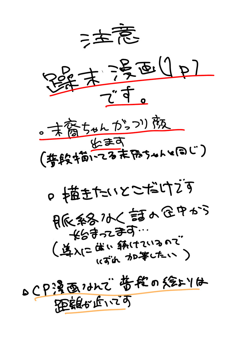 いまさら☆quiet followMOURNING躁末漫画1ページです導入が完成しそうになく、諦め1ページ目は注意書きと言い訳です2ページ目本編です show all(+1 images) Tap to full screen (size:1075x1518).Repost is prohibited Let's send reactions! freqpopularsnackothersPayment processing Replies from the creator Follow creator you care about!☆quiet follow いまさらMOURNING没とか練習とかの ジャンルは色々…アイビスのデータを消し飛ばした供養 11 いまさらDOODLE冬 幻斗さんと末裔ちゃん いまさらMOURNING躁末漫画1ページです導入が完成しそうになく、諦め1ページ目は注意書きと言い訳です2ページ目本編です 2 いまさらSPOILER漆と末裔ちゃん 2枚幼少期捏造 2 いまさらSPOILER龍馬探偵感想 ネタバレあります 2 いまさらDONE絶◯先生パロ② 1ページオチなし漫画絶先の構図好き特典CDのネタバレが僅かにあります