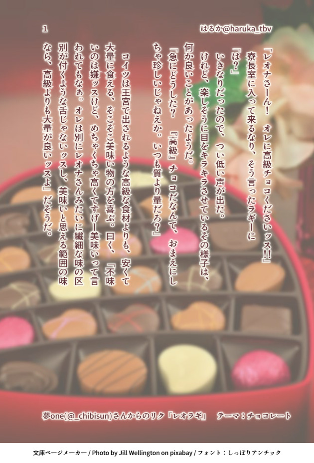 はるか@haruka_tbv☆Тайно следоватьСДЕЛАНОバレンタインポストで遊んでいた時季、リク頂いて書いたたSSです。初書きレオラギ。 #レオラギ показать все (+ 8 изображений) Нажмите, чтобы открыть (размер: 630 x 928) в полноэкранном режиме.Репост запрещен Отправим отзывы! частотапопулярныйлегкая закускадругиеПроцесс оплаты Ответы от создателя Следуйте за нами тайно!☆Тайно следовать はるか@haruka_tbvСДЕЛАНОバレンタインポストで遊んでいた時季、リク頂いて書いたたSSです。初書きレオラギ。 9 はるか@haruka_tbvСДЕЛАНО第16回レオラギ版ワンドロ・ワンライお題『花火』過去お題の上に遅刻ですが、やっと初参加です!SSですが画像です。私的には定番の、残暑お見舞い なハガキ仕様です。離れて見ると、文字が分かると思います。描写が激しくないのでR18とまではしませんが、真っ最中です。ご注意ください。#レオラギ1D_1W はるか@haruka_tbvСДЕЛАНО監♀受け版ワンドロ&ワンライ過去お題参加 第53回 呪(まじな)い監♀初書き 男装監♀ 恋人未満レオ🦁監♀ですが、つの🐉タロが出張ってます。男子がひたすら蘊蓄をしゃべる。王族同士間で未来の予定を勝手に牽制するお話。お気に入りを並べて愛でたい若様なので、💚感情はないです。各種捏造多々#女監督生受け版ワンドロワンライ #twstプラス 11628 сопутствующие работы matoКАРАКУЛИやりたい🦁とまだ眠い🍩 Kyouka9696КАРАКУЛИ自分が一番書いてて好きな行為を書いただけ。ほんのりピンクだけど濃密ピンクなレオラギです。 4 ryakuko_387КАРАКУЛИまとめました!【TLに流れてきたハイエナのポーズを参考に描くブッチくんシリーズ】①〜⑩20230325〜0430 10 まりくれКАРАКУЛИ微妙にセンシティブな🦁🍩いつのまにかいるレさん まりくれСДЕЛАНО社会人パロどうかゆるく見てくださいこの後くっつきます!(続きません) namakinkoСДЕЛАНОねこの日のにゃんにゃんしてるレオラギを…2コマ目のラギーくんのお耳気に入ってるのでなんとなく文字なしもいれてみましたが、台詞がほとんどないからあまり意味はないかも 2 a_ya_a_y_aСДЕЛАНОレオラギ「おでかけ」お題おかりしました。青姦1時間+45分くらい… 8 びびびКАРАКУЛИえちらくがきレオラギだけどほぼラだけ ryakuko_387КАРАКУЛИ2023/04 Log② 【1枚まんが】 3 рекомендуемые работы 柚木(insheaht70)ПРОГРЕССフロ監♀の浮気?ネタの続きで、その頃の学園長&フロイド視点です。後でpixivにアップします。#twstプラス #twst夢 10 twst64546382СДЕЛАНО「豆イベのちっちゃい小エビ①」オクタ監♀(顔ある。しゃべる)小エビへの好感度がカンストしているオクタのマンガ(次で終わりです) #twstプラス #twst夢 まめこあけびСДЕЛАНОおやつ食べてるラギ監♀ちゃんのなんでもない日🐆「オレが…オレが腹一杯食わせてやらないと…」 はなぶさСДЕЛАНО #イデ監 💀🌸『イデアぱいせん“で“遊ぶ』⚠10回クイズ第4弾#twstプラス #twstプラス_NL #twst夢 ymmsr_lkСДЕЛАНО嬉しそうに報告してくる🌸※トレスです。 ウツノミヤケイКАРАКУЛИへたな変装をしてトキと共闘するシュさまが見たい。 syun_ithukiСПОЙЛЕРレオラギ ※『タマーシュナ・ムイナ』ネタタマムイ初日にレオナ(起きてたのに)鏡の間に来るの超ギリで更に『眠い』とかのたまわっていたので「You,昨晩から今朝ギリギリまで何してたの?」って思った話。 ymmsr_lkКАРАКУЛИ弊社🌸のハロウィン衣装考えてたらハロウィン終わった。 ざくろКАРАКУЛИ 2815