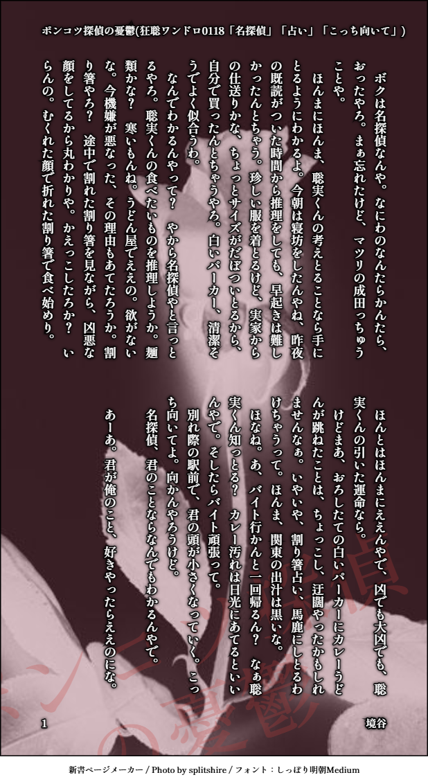 kuusakaya☆quiet followDONEポンコツ探偵の憂鬱(狂聡ワンドロ0118「名探偵」「占い」「こっち向いて」)執筆時間35分くらい(翌日修正さしかえ)#狂聡ワンドロライ@kyst1drawrite Tap to full screen (size:618x1132).Repost is prohibited Let's send reactions! freqpopularsnackothersPayment processing Replies from the creator Follow creator you care about!☆quiet follow kuusakayaDONEレイトショー(狂聡ワンドロライ18「年の差」「休日」「タイムリミット」)執筆時間30分くらい 整形25分くらい狂聡四畳半4520 付き合っている二人#狂聡ワンドロライ@kyst1drawrite kuusakayaDONE子犬のスリッパ(狂聡ワンドロライ19「雨宿り」「くっつく」「土足厳禁」)執筆時間30分くらい 整形15分くらい狂聡3914 つきあっていない二人#狂聡ワンドロライ@kyst1drawrite kuusakayaDONE晩夏(狂聡ワンドロライ0906「素足」「サプライズ」「香水」)執筆時間30分くらい 整形20分くらい狂聡3914 紅事変のあとの、ない夏の終わり#狂聡ワンドロライ@kyst1drawrite 2 kuusakayaDOODLE花占い(狂聡ワンドロライ0816「花言葉」「賭け事」「はじめて」)執筆時間30分くらい 整形20分くらい付き合ってる大人な二人だけどはじめてはまだ(今から)#狂聡ワンドロライ@kyst1drawrite 2 kuusakayaDOODLEパンツを捨てる旅(狂聡ワンドロライ0802「あくび」「背伸び」「ほころび」)執筆時間30分くらい 整形10分くらいただいちゃいちゃしてるつきあってる二人#狂聡ワンドロライ@kyst1drawrite kuusakayaDOODLE君はほんまにそういう時に容赦がないよな(狂聡ワンドロライ0719「熱帯夜」「独り占め」「にぶいひと」)執筆時間1時間15分くらい 整形20分くらい#狂聡ワンドロライ@kyst1drawrite 2 related works kuusakayaDONEポンコツ探偵の憂鬱(狂聡ワンドロ0118「名探偵」「占い」「こっち向いて」)執筆時間35分くらい(翌日修正さしかえ)#狂聡ワンドロライ@kyst1drawrite kuusakayaDONE四畳半炎上報告(「痕」「四畳半」「君となら」)執筆時間不明なんでも許せる方向け#狂聡ワンドロライ@kyst1drawrite 2 miku_otkntDONE狂聡ワンライお題「名探偵」お借りしましたふんわり成人向け18↑? y/n 6 kuusakayaDONE湯煙パーフェクトプラン(狂聡ワンドロ0201「温泉」「ペアルック」「先手必勝」)執筆時間45分くらい 整形15分(大幅遅刻)#狂聡ワンドロライ@kyst1drawrite 3 サシメシDONEお題:『気障』#狂聡ワンドロライ@kyst1drawrite辞書を引くのが好きなので、あまり甘ったるくない『気障』になりました。2025/2/15参加 1674 kuusakayaDOODLE君はほんまにそういう時に容赦がないよな(狂聡ワンドロライ0719「熱帯夜」「独り占め」「にぶいひと」)執筆時間1時間15分くらい 整形20分くらい#狂聡ワンドロライ@kyst1drawrite 2 kuusakayaDONEそれはGOODでNEWなこと。(「ゲーム」「恋人自慢」「行かないで」)執筆40分ほど+整形バカップルが会話しているだけ#狂聡ワンドロライ@kyst1drawrite miku_otkntDONEお題「君となら」お借りしました。執筆1h#狂聡ワンドロライ@kyst1drawrite 7 kuusakayaDONE天使の迷子放送(狂聡ワンドロ0215「気障」「勘違い」「つかまえた」)執筆時間30分くらい 整形15分(一週間遅刻)#狂聡ワンドロライ@kyst1drawrite 2 recommended works ともりDOODLE朝菊 R18pass:18↑? Y/N STss81xxxDOODLE【愛になるまで】3914『従順』『彼シャツ』『まがいもの』すべてお借りしました。#狂聡ワンドロライ@kyst1drawriteフェあるので18歳以上の方お楽しみください。パスワード18歳以上ですか?(y/n) 2444 kahasangDOODLE復健,澀一下小任⚠️未成年色情⚠️cuntboy密码殇生日 3 TAMAandBOUworldDOODLE暴投もカバーするよっ @miyama428DOODLEwebイベント用の新規書き下ろしイラストです。(参考資料有り) 2 EGODOODLEアイコンのボルドー 右巻きかたつむりDONEむちぃっぴくしぶにもあるのでよろしくお願いします。 こうちゃ🫖INFOCoC『レプリカントの葬列』KP:せうちHO1怪盗:九蓮/🫖HO2贋作師:孤洞木/くーちゃん▷END A 両生還 trionesDONE搞点站街 4155