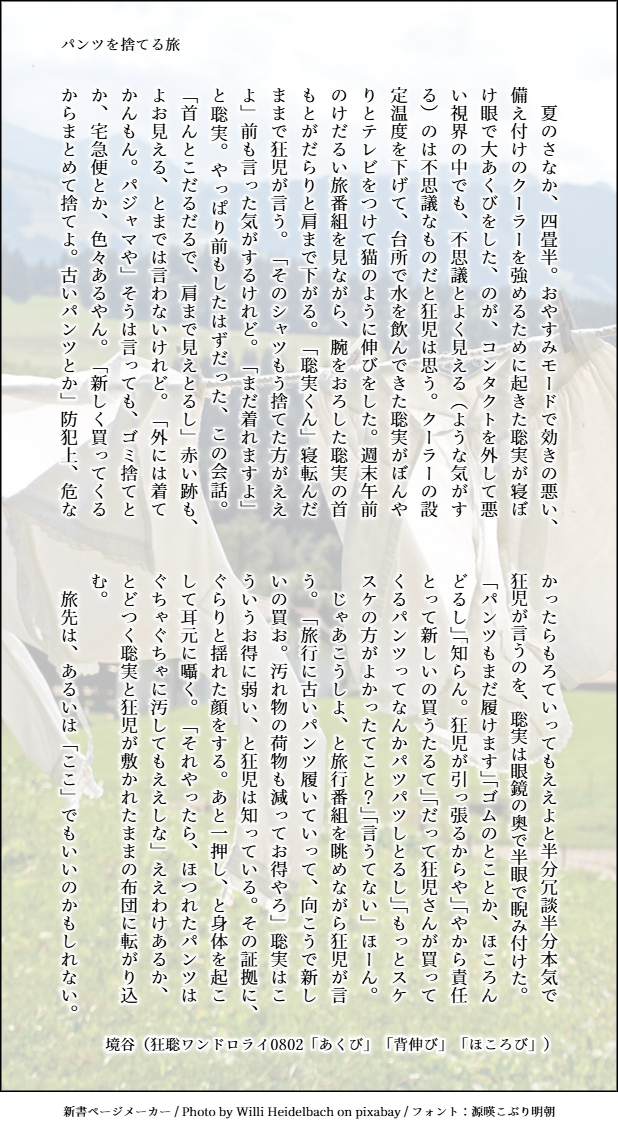 kuusakaya☆quiet followDOODLEパンツを捨てる旅(狂聡ワンドロライ0802「あくび」「背伸び」「ほころび」)執筆時間30分くらい 整形10分くらいただいちゃいちゃしてるつきあってる二人#狂聡ワンドロライ@kyst1drawrite Tap to full screen (size:618x1132).Repost is prohibited Let's send reactions! freqpopularsnackothersPayment processing Replies from the creator Follow creator you care about!☆quiet follow kuusakayaDONEレイトショー(狂聡ワンドロライ18「年の差」「休日」「タイムリミット」)執筆時間30分くらい 整形25分くらい狂聡四畳半4520 付き合っている二人#狂聡ワンドロライ@kyst1drawrite kuusakayaDONE子犬のスリッパ(狂聡ワンドロライ19「雨宿り」「くっつく」「土足厳禁」)執筆時間30分くらい 整形15分くらい狂聡3914 つきあっていない二人#狂聡ワンドロライ@kyst1drawrite kuusakayaDONE晩夏(狂聡ワンドロライ0906「素足」「サプライズ」「香水」)執筆時間30分くらい 整形20分くらい狂聡3914 紅事変のあとの、ない夏の終わり#狂聡ワンドロライ@kyst1drawrite 2 kuusakayaDOODLE花占い(狂聡ワンドロライ0816「花言葉」「賭け事」「はじめて」)執筆時間30分くらい 整形20分くらい付き合ってる大人な二人だけどはじめてはまだ(今から)#狂聡ワンドロライ@kyst1drawrite 2 kuusakayaDOODLEパンツを捨てる旅(狂聡ワンドロライ0802「あくび」「背伸び」「ほころび」)執筆時間30分くらい 整形10分くらいただいちゃいちゃしてるつきあってる二人#狂聡ワンドロライ@kyst1drawrite kuusakayaDOODLE君はほんまにそういう時に容赦がないよな(狂聡ワンドロライ0719「熱帯夜」「独り占め」「にぶいひと」)執筆時間1時間15分くらい 整形20分くらい#狂聡ワンドロライ@kyst1drawrite 2 related works kuusakayaDONE湯煙パーフェクトプラン(狂聡ワンドロ0201「温泉」「ペアルック」「先手必勝」)執筆時間45分くらい 整形15分(大幅遅刻)#狂聡ワンドロライ@kyst1drawrite 3 kuusakayaDONE四畳半炎上報告(「痕」「四畳半」「君となら」)執筆時間不明なんでも許せる方向け#狂聡ワンドロライ@kyst1drawrite 2 kuusakayaDOODLE君はほんまにそういう時に容赦がないよな(狂聡ワンドロライ0719「熱帯夜」「独り占め」「にぶいひと」)執筆時間1時間15分くらい 整形20分くらい#狂聡ワンドロライ@kyst1drawrite 2 kuusakayaDONE天使の迷子放送(狂聡ワンドロ0215「気障」「勘違い」「つかまえた」)執筆時間30分くらい 整形15分(一週間遅刻)#狂聡ワンドロライ@kyst1drawrite 2 miku_otkntDONEお題「君となら」お借りしました。執筆1h#狂聡ワンドロライ@kyst1drawrite 7 サシメシDONEお題:『気障』#狂聡ワンドロライ@kyst1drawrite辞書を引くのが好きなので、あまり甘ったるくない『気障』になりました。2025/2/15参加 1674 kuusakayaDONEポンコツ探偵の憂鬱(狂聡ワンドロ0118「名探偵」「占い」「こっち向いて」)執筆時間35分くらい(翌日修正さしかえ)#狂聡ワンドロライ@kyst1drawrite miku_otkntDONE狂聡ワンライお題「名探偵」お借りしましたふんわり成人向け18↑? y/n 6 kuusakayaDONEそれはGOODでNEWなこと。(「ゲーム」「恋人自慢」「行かないで」)執筆40分ほど+整形バカップルが会話しているだけ#狂聡ワンドロライ@kyst1drawrite recommended works STss81xxxDOODLE【愛になるまで】3914『従順』『彼シャツ』『まがいもの』すべてお借りしました。#狂聡ワンドロライ@kyst1drawriteフェあるので18歳以上の方お楽しみください。パスワード18歳以上ですか?(y/n) 2444 よぐるとDOODLEどっちなんでしょうかね…どっちにもそれぞれうまみがある…pass:18↑?(yes/no) わーちゃん/藤山DOODLEミズタ受け🔞触手消毒されながら演奏してるちょい加筆 AnchorDOODLE chocola_mio17DOODLE tartdandyDOODLE이상한낙서들자해요소 지전많습니다(주의) 5 ねこいろPAST1年に描いた立ち絵まとめ2024年のぶんを追加〜 4 さわらDOODLE 三辺紗那DONE四季送り自陣の春夏に、通過時点で季節外れだったハロウィンのコスプレをしてもらったよ!服の色合いとか、髪型とか小ネタ仕込みまくってるので探してみてね!お借りした子→夏祈 燈華ちゃん(丹黄さん)