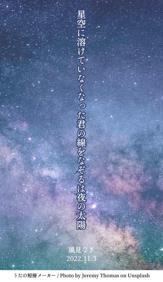 kazaminagi_☆quiet followPAST2022.11.3星空に溶けていなくなった君の線をなぞるは夜の太陽 #短歌 31-moraJapanesePoem Tap to full screen (size:550x950).Repost is prohibited Let's send reactions! freqpopularsnackothersPayment processing Replies from the creator Follow creator you care about!☆quiet follow kazaminagi_PAST「なに飲むの」分かっていても聞いちゃうね、僕にはくれない甘い気持ちを kazaminagi_PAST2022.11.9まだ朱いもっと朱いと手を伸ばす君の頬にも薄紅のせる kazaminagi_PAST2022.11.8ビー玉を映し煌めくその瞳今宵映すは空の一つ目 kazaminagi_PAST2022.11.3雑踏に浮く午前零時の東尋坊人差し指の向く先は空 kazaminagi_PAST2022.11.3星空に溶けていなくなった君の線をなぞるは夜の太陽 related works やしおひさのDONE最近作ってた短歌です。以前投稿したものも含みます。ほぼ刀さに。 4 あやかたDONEたーんかー 3 高間晴MOURNING知人の百合短歌に送った返歌集ですもったいないので収納しておく 12 山寺_1003DONE春ですね 能見夜市DONEオリジナルの短歌を詠みました!#密やか歌詠み徒然草空蝉の夢「あなたも夢もこんなに好きだった」 oshiroi__SPOILERバイサマ 未通過× 同卓〇戌玖まとで詠んでみた。 twilight_topazMOURNING一時期BL短歌的なものをよむのにはまってました nakami737DOODLE歌 耐えられなくなったら消す shiranami_bbbDONE七マリ短歌です recommended works BLYi5DOODLE本気で追いかけてくるジョゼと颯爽と逃げるいそぴ うらひとPASTこれは分冊版『喫茶店フォレスタ』各巻の中扉にしている短歌 4 茶和子PAST今まで書いた詩や短歌をぽいぽい 22 山寺_1003DONEさらわれてしまうまえに 山寺_1003DONE芽が出るだけで、こんなにうれしい 山寺_1003DONE「たられば」はありえないでも、夢想するだけ、なら kazaminagi_PAST2022.11.3星空に溶けていなくなった君の線をなぞるは夜の太陽 kazaminagi_PAST2022.11.8ビー玉を映し煌めくその瞳今宵映すは空の一つ目 kazaminagi_PAST「なに飲むの」分かっていても聞いちゃうね、僕にはくれない甘い気持ちを