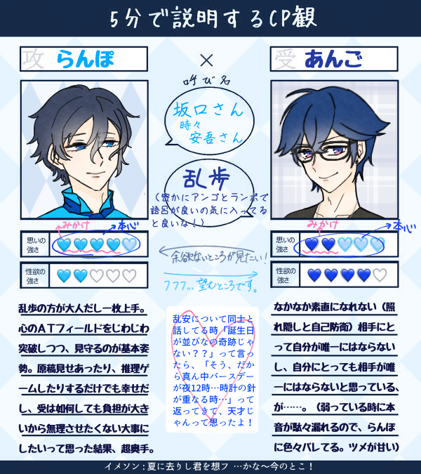 ほろのポイピク☆quiet followMEMO5分で〜CP観のやつ!【乱安・らんあん・rnan編!】忘れないうちにあげる!伝えたいことを厳選したらシリアス気味になっちゃったけど、バタバタわちゃわちゃしてるのも好きデス……。 Tap to full screen (size:600x675).Repost is prohibited Let's send reactions! freqpopularsnackothersPayment processing Replies from the creator Follow creator you care about!☆quiet follow ほろのポイピクSPOILERノベライズ〜〜〜〜〜〜💓な落書き②脳内スクショ風(?)、ネタバレなので読んでから見てね! 2 ほろのポイピクSPOILERノベライズ〜〜〜〜〜〜💓なちょっとした落書き①読んでから見てね(ネタバレ)! ほろのポイピクSPOILER文劇6のメモみたいな落書き① ほろのポイピクSPOILER⚠︎金カム本誌309話⚠︎ネタバレ注意⚠︎今週の本誌読んでワワッ‼︎てなって描いたやつ(杉と尾、杉とリパさん+差分2枚)今まではリパさんが杉の楔(リパさんが杉を引き戻す)って形だったけど、ここに来てお互いがお互いを昇っていっちゃわないように、帰ってこれるように繋ぎ止めるっていう形になったのかなと……(2人の目の描写のスイッチングはそういうことかなぁなんて思ったり)。 4 ほろのポイピクSPOILER※文劇3に感化されたやつ※ネタバレ※ ほろのポイピクDOODLE※肌色注意!!!※乱安・らんあん・rnanキス絵リベンジ!!(前キスしてなかったから!💧)すーぐ弱らせちゃうのゴメンね!!🙏🏻💦💦 recommended works まぐろPROGRESSラブラブの余りIQが低下しているモブ霊 waioTRAINING棘刺 お散歩牛乳DONE⚠️肌色多め・ラィヵがビキニを着ていますハート目差分あり 3 mitaraikamioriPAST鉢雷かわいいね!! 2 Hiyori_seitenINFOCoCシナリオ『君が為のビトレイアル』作者/KP:kiriさんPL/PC:HO.1:ふくちさん/千鳥HO.2:晴天/片喰END-T、両生還にてシナリオ終了しましたお疲れ様でした🐶🐶道は別れたけど、それぞれの人生を見守ろうと思いましたテストプレイ参加出来て嬉しかったです!ありがとうございました!「それが、千鳥が考えた答えなんでしょ?」 ハニワMAIKINGタイッツーのお題「宝箱」で宝箱に埋まってるリカードが描きたくなって参加したものです。 YunaDOODLE에스루시18↑ : [yes/no] なるこDOODLE龍8山井一派〜〜全く気付かずぼや〜っとしてる人と、いつ気付くんだろうなぁ………って観察してる人。トミザワくんには突然気付いてビビって縮こまる未来しかないw#なるこ絵描き riotanuSPOILERかいぶつたちとマホラカルト 現行、未通過×2陣目魔女さんに事後ってマジかよMy Buddy!?回させていただいたのでスクショですかいマホのネタバレがあります 2