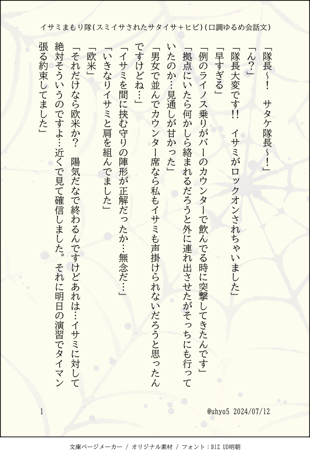 2024/07/12 Xに投稿したスミイサされたサタイサ+ヒビキの会話文です。