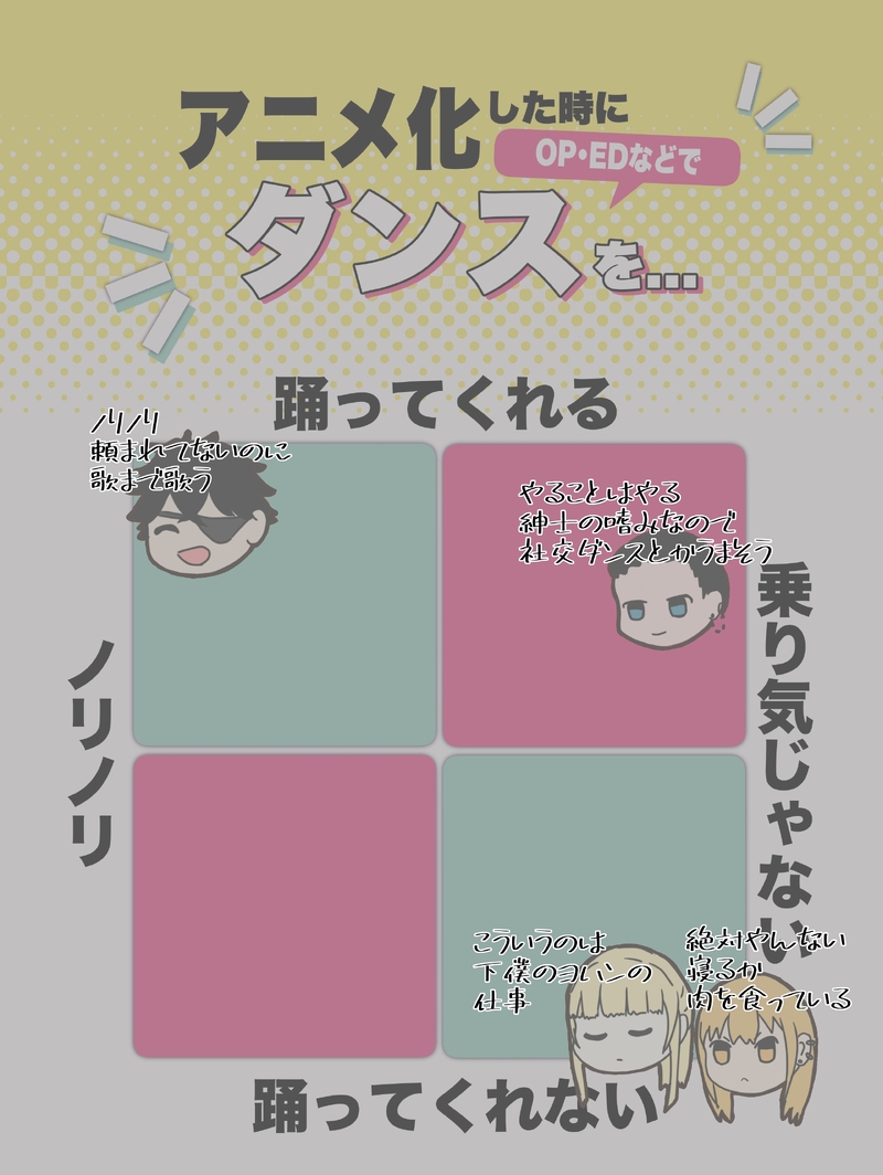 マットクーガさんは右下だろうけど個人的願望としては渋々踊って欲しい これは癖なんですがハルベルちゃんとクーガさんが関わることがあったら可愛すぎて死ぬ…キャッキャ踊るハルベルちゃんにおてて引かれて踊るしかなくなるクーガさん可愛すぎないか?