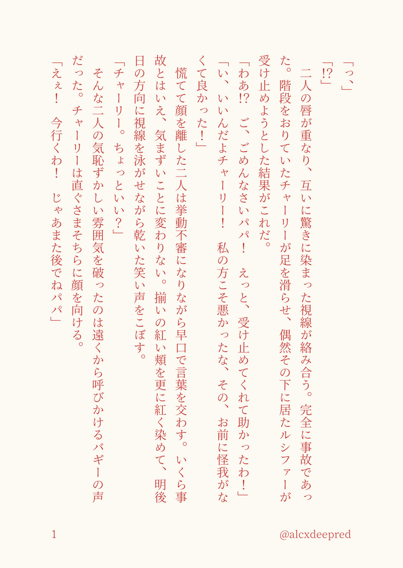 🍎→(∞)→🌈ではあるんですが、🍎の唇が忘れられなくてどきどきしてしまう🌈がいたらかわいいなと思います。でも幼少期とかに頬や額にちゅーするノリで🌈から🍎にパパ大好きのちゅーとかして🍎を様々な感情で悶えさせ困らせちゃう幼少期🌈も見たいですね……