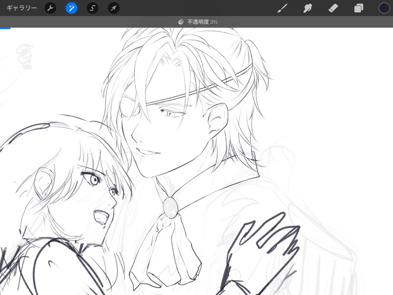 ハーフアップも難しい殿下。いつも大変なのを(失敬)先に描いている。先生はもっと顔を可愛くしたいが加減が難しい。やりすぎると殿下と釣り合わないので、、