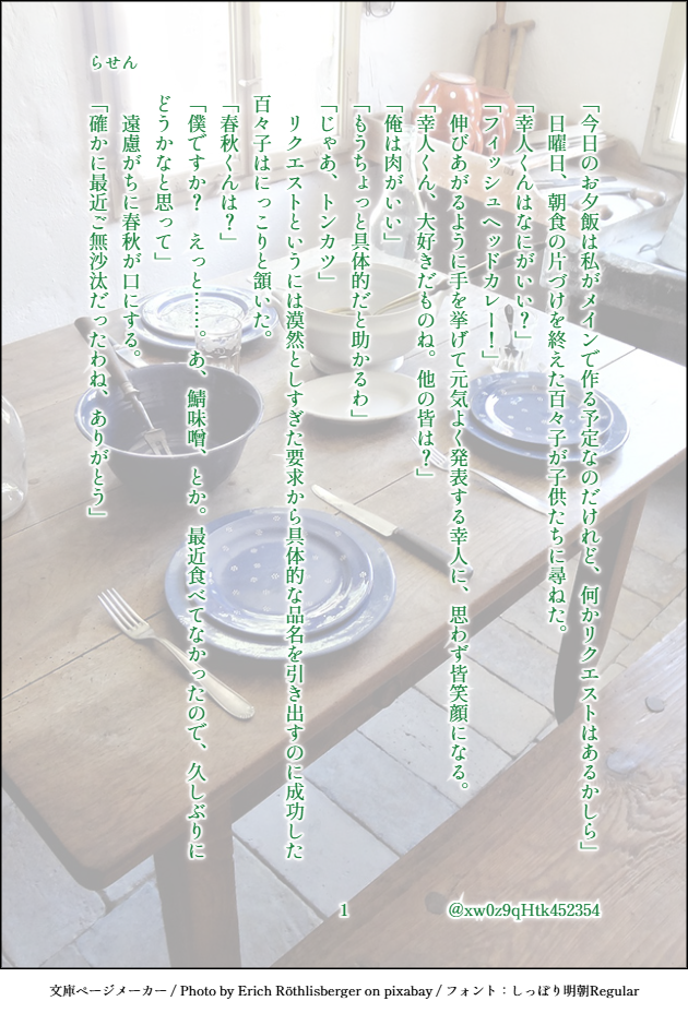 xw0z9qHtk452354☆quiet followDONEテーマ:【鯖味噌】【矢】 CP:なし登場人物:百々子、幸人、尽義、春秋、朱、真人、ハツ尽義が8歳前後のある日のお話#あやかい真剣60分一本勝負(7/7) show all(+6 images) Tap to full screen (size:630x928).Repost is prohibited Let's send reactions! freqpopularsnackothersPayment processing Replies from the creator Follow creator you care about!☆quiet follow xw0z9qHtk452354DONEテーマ:【ルート】【羊】(+1h)CP:なし 登場人物:幸人、茶太郎、夜胡、いばら、尽義、百々子(、名前のみ登場のオリキャラ)大いに願望入ってます文系数学(Ⅱ・B)までの記憶を掘り返し、色々確認しつつ書きましたがなにか違っていたらすみません私の時と現在の学習年は変わってる可能性あるので、あの島ではこうということにしておいてください#あやかい真剣60分一本勝負(8/8) 8 xw0z9qHtk452354DONEテーマ:【秋刀魚】【労働】CP:なし登場人物:尽義、幸人、真人、春秋、朱、百々子、ハツ幼少期メインに、現在軸も少し#あやかい真剣60分一本勝負(6/6) 6 xw0z9qHtk452354DONEテーマ:【骨】【「理屈はいいから」】(+1.5h)CP:なし登場人物:幸人、茶太郎、夜胡、いばら、尽義、百々子ちょこちょこ捏造要素あります#あやかい真剣60分一本勝負(8/8) 8 xw0z9qHtk452354DONEテーマ:【祭り】【スタンプ】CP:なし登場人物:幸人、尽義、百々子高1の夏祭り成績に関しては完全な妄想ウェブオンリー展示作品「夢からまことが出るならば」(支部にアップ済)とリンクしていますが、これのみでも読めます#あやかい真剣60分一本勝負(8/8) 8 xw0z9qHtk452354DONEテーマ:【ぎゅっ】【澪標】(+1h)CP:なし登場人物:幸人、茶太郎、夜胡、いばら、尽義、百々子、オリキャラ古典教師幸人高1の夏※ぎゅっは幸人→尽義ですが、この時点では兄弟・師弟としての感情想定オリキャラいます参考にしたのは田辺聖子先生の「新源氏物語」(新潮文庫)の澪標と蛍の部分です。#あやかい真剣60分一本勝負(9/9) 9 xw0z9qHtk452354DONEテーマ:【ローストビーフ丼】【鎖】(+1h)CP:なし登場人物:朱、薪田、鬼無里島に帰って一年ほどの朱の誕生日SS6、7のネタバレあり伊吹の意図やこの時期のことなど、かなり捏造しています#あやかい真剣60分一本勝負(8/8) 8 related works xw0z9qHtk452354DONEテーマ:【カラオケ】【禁】(+1h)CP:なし登場人物:幸人、尽義、伊吹、鞍馬人によってキャラ崩壊と感じる箇所があるかもしれません曲はお好きなもので想像していただければ#あやかい真剣60分一本勝負(10/10) 10 xw0z9qHtk452354DONEテーマ:【嫉妬】【アルカンシエル】(+1h)CP:朱春・幸尽前提、春と幸のCPっぽい発言(左右はお好きな方で)があります登場人物:幸人、尽義、春秋、朱、稲生朱春/幸尽前提の未来設定(作中でいちゃついてないが付き合っている)なのに春と幸がレストランで……という話#あやかい真剣60分一本勝負(7/7) 7 xw0z9qHtk452354DONEテーマ:【ルート】【羊】(+1h)CP:なし 登場人物:幸人、茶太郎、夜胡、いばら、尽義、百々子(、名前のみ登場のオリキャラ)大いに願望入ってます文系数学(Ⅱ・B)までの記憶を掘り返し、色々確認しつつ書きましたがなにか違っていたらすみません私の時と現在の学習年は変わってる可能性あるので、あの島ではこうということにしておいてください#あやかい真剣60分一本勝負(8/8) 8 xw0z9qHtk452354DONEテーマ:【秋刀魚】【労働】CP:なし登場人物:尽義、幸人、真人、春秋、朱、百々子、ハツ幼少期メインに、現在軸も少し#あやかい真剣60分一本勝負(6/6) 6 xw0z9qHtk452354DONEテーマ:【結界】【らくがき】CP:なし登場人物:尽義、百々子、オリキャラ尽義がまだ小学生だった、噴火翌年の春の話※オリキャラがいます!何時間かかったか分からない(ワンライとは……)#あやかい真剣60分一本勝負 (9/9) 9 xw0z9qHtk452354DONEテーマ:【冬の花火】【メガネ】(+1h)CP:なし登場人物:尽義、稲生、百々子噴火から一年くらい経った頃の話実際の法律や制度を調べたわけではないので、おかしい所がありましたらご容赦を勝手な捏造設定もあります#あやかい真剣60分一本勝負 (6/6) 6 xw0z9qHtk452354DONEテーマ:【XYZ】【指輪】(+1.5h)CP:幸尽(成立済)登場人物:幸人、尽義、茶太郎、夜胡、いばら、薪田、伊吹幸人20歳↑の未来時空春と朱は和解しています#あやかい真剣60分一本勝負(9/9) 9 xw0z9qHtk452354DONEテーマ:【海風】【鬼の居ぬ間の洗濯】(+2h)CP:なし登場人物:尽義、百々子、伊吹、金崎、薪田、鞍馬、幸人SSのネタバレと捏造ありちょっと触れた尽義の修学旅行話は、以前のワンライ(雪見障子と充電器の回)で書いたものです#あやかい真剣60分一本勝負(11/11) 11 xw0z9qHtk452354DONEテーマ:【狐火】【初音】(+1.5h)CP:なし登場人物:幸人、茶太郎、夜胡、いばら、尽義、百々子高2の冬のお話#あやかい真剣60分一本勝負(9/9) 9 recommended works 右yoDOODLEtag私心/夹带了一堆xp特别草率的爽一点cunt boy小盖……😋到底该怎么治好我开车开的很烂的毛病……😡😡密码:(是否满十八岁:yes /no) 2 smhk_yDOODLEサブにあげたらくがきまとめ!にょた、別ジャンルあり 26 ☀︎☔︎.DONEうちの創作について。 4 matashita20000MDOODLEBye-Bye Summer days無敵一鉄の立ち絵差分 3 matas