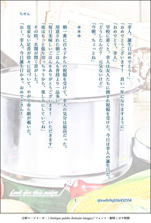 xw0z9qHtk452354☆quiet followDONEテーマ:【フィッシュヘッドカレー】【タオル】CP:なし登場人物:幸人、茶太郎、夜胡、いばら、尽義、百々子#あやかい真剣60分一本勝負(8/8) show all(+7 images) Tap to full screen (size:630x928).Repost is prohibited Let's send reactions! freqpopularsnackothersPayment processing Replies from the creator Follow creator you care about!☆quiet follow xw0z9qHtk452354DONEテーマ:【ルート】【羊】(+1h)CP:なし 登場人物:幸人、茶太郎、夜胡、いばら、尽義、百々子(、名前のみ登場のオリキャラ)大いに願望入ってます文系数学(Ⅱ・B)までの記憶を掘り返し、色々確認しつつ書きましたがなにか違っていたらすみません私の時と現在の学習年は変わってる可能性あるので、あの島ではこうということにしておいてください#あやかい真剣60分一本勝負(8/8) 8 xw0z9qHtk452354DONEテーマ:【秋刀魚】【労働】CP:なし登場人物:尽義、幸人、真人、春秋、朱、百々子、ハツ幼少期メインに、現在軸も少し#あやかい真剣60分一本勝負(6/6) 6 xw0z9qHtk452354DONEテーマ:【骨】【「理屈はいいから」】(+1.5h)CP:なし登場人物:幸人、茶太郎、夜胡、いばら、尽義、百々子ちょこちょこ捏造要素あります#あやかい真剣60分一本勝負(8/8) 8 xw0z9qHtk452354DONEテーマ:【祭り】【スタンプ】CP:なし登場人物:幸人、尽義、百々子高1の夏祭り成績に関しては完全な妄想ウェブオンリー展示作品「夢からまことが出るならば」(支部にアップ済)とリンクしていますが、これのみでも読めます#あやかい真剣60分一本勝負(8/8) 8 xw0z9qHtk452354DONEテーマ:【ぎゅっ】【澪標】(+1h)CP:なし登場人物:幸人、茶太郎、夜胡、いばら、尽義、百々子、オリキャラ古典教師幸人高1の夏※ぎゅっは幸人→尽義ですが、この時点では兄弟・師弟としての感情想定オリキャラいます参考にしたのは田辺聖子先生の「新源氏物語」(新潮文庫)の澪標と蛍の部分です。#あやかい真剣60分一本勝負(9/9) 9 xw0z9qHtk452354DONEテーマ:【ローストビーフ丼】【鎖】(+1h)CP:なし登場人物:朱、薪田、鬼無里島に帰って一年ほどの朱の誕生日SS6、7のネタバレあり伊吹の意図やこの時期のことなど、かなり捏造しています#あやかい真剣60分一本勝負(8/8) 8 related works xw0z9qHtk452354DONEテーマ:【XYZ】【指輪】(+1.5h)CP:幸尽(成立済)登場人物:幸人、尽義、茶太郎、夜胡、いばら、薪田、伊吹幸人20歳↑の未来時空春と朱は和解しています#あやかい真剣60分一本勝負(9/9) 9 xw0z9qHtk452354DONEテーマ:【海風】【鬼の居ぬ間の洗濯】(+2h)CP:なし登場人物:尽義、百々子、伊吹、金崎、薪田、鞍馬、幸人SSのネタバレと捏造ありちょっと触れた尽義の修学旅行話は、以前のワンライ(雪見障子と充電器の回)で書いたものです#あやかい真剣60分一本勝負(11/11) 11 xw0z9qHtk452354DONEテーマ:【カラオケ】【禁】(+1h)CP:なし登場人物:幸人、尽義、伊吹、鞍馬人によってキャラ崩壊と感じる箇所があるかもしれません曲はお好きなもので想像していただければ#あやかい真剣60分一本勝負(10/10) 10 xw0z9qHtk452354DONEテーマ:【狐火】【初音】(+1.5h)CP:なし登場人物:幸人、茶太郎、夜胡、いばら、尽義、百々子高2の冬のお話#あやかい真剣60分一本勝負(9/9) 9 xw0z9qHtk452354DONEテーマ:【嫉妬】【アルカンシエル】(+1h)CP:朱春・幸尽前提、春と幸のCPっぽい発言(左右はお好きな方で)があります登場人物:幸人、尽義、春秋、朱、稲生朱春/幸尽前提の未来設定(作中でいちゃついてないが付き合っている)なのに春と幸がレストランで……という話#あやかい真剣60分一本勝負(7/7) 7 xw0z9qHtk452354DONEテーマ:【冬の花火】【メガネ】(+1h)CP:なし登場人物:尽義、稲生、百々子噴火から一年くらい経った頃の話実際の法律や制度を調べたわけではないので、おかしい所がありましたらご容赦を勝手な捏造設定もあります#あやかい真剣60分一本勝負 (6/6) 6 xw0z9qHtk452354DONEテーマ:【ルート】【羊】(+1h)CP:なし 登場人物:幸人、茶太郎、夜胡、いばら、尽義、百々子(、名前のみ登場のオリキャラ)大いに願望入ってます文系数学(Ⅱ・B)までの記憶を掘り返し、色々確認しつつ書きましたがなにか違っていたらすみません私の時と現在の学習年は変わってる可能性あるので、あの島ではこうということにしておいてください#あやかい真剣60分一本勝負(8/8) 8 xw0z9qHtk452354DONEテーマ:【結界】【らくがき】CP:なし登場人物:尽義、百々子、オリキャラ尽義がまだ小学生だった、噴火翌年の春の話※オリキャラがいます!何時間かかったか分からない(ワンライとは……)#あやかい真剣60分一本勝負 (9/9) 9 xw0z9qHtk452354DONEテーマ:【秋刀魚】【労働】CP:なし登場人物:尽義、幸人、真人、春秋、朱、百々子、ハツ幼少期メインに、現在軸も少し#あやかい真剣60分一本勝負(6/6) 6 recommended works おにくお そうめんTRAINING斎山SS カルデア時空 HENTAI 単衣を単って誤字がある 肘を膝って誤字がある 6 モまくまくDOODLE⚠️チャプター4注意ですごめんなさい😭推し絵師様のせいで嫌われるタイプの夢絵が好きなんですよ… 桝野ヨシタカDOODLE自分とこ二人とも男主人公、隠し刀×片割れ。最早オリジナルで?ε(*'-')