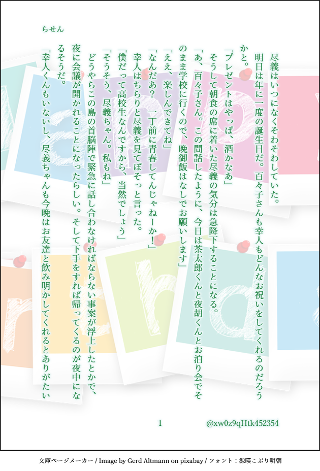 xw0z9qHtk452354☆quiet followDONEテーマ:【サイダー】【「嘘だろ!?」】(+2h)CP:なし登場人物:尽義、幸人、朱、春秋、薪田、金崎、風林、水谷、隠田、茶太郎、夜胡、いばら、百々子、屋敷、猿渡、御手洗、亀井戸、稲生SS、前夜などあちこちネタバレ幸人高2#あやかい真剣60分一本勝負(13/13) show all(+12 images) Tap to full screen (size:630x928).Repost is prohibited Let's send reactions! freqpopularsnackothersPayment processing Replies from the creator Follow creator you care about!☆quiet follow xw0z9qHtk452354DONEテーマ:【ルート】【羊】(+1h)CP:なし 登場人物:幸人、茶太郎、夜胡、いばら、尽義、百々子(、名前のみ登場のオリキャラ)大いに願望入ってます文系数学(Ⅱ・B)までの記憶を掘り返し、色々確認しつつ書きましたがなにか違っていたらすみません私の時と現在の学習年は変わってる可能性あるので、あの島ではこうということにしておいてください#あやかい真剣60分一本勝負(8/8) 8 xw0z9qHtk452354DONEテーマ:【秋刀魚】【労働】CP:なし登場人物:尽義、幸人、真人、春秋、朱、百々子、ハツ幼少期メインに、現在軸も少し#あやかい真剣60分一本勝負(6/6) 6 xw0z9qHtk452354DONEテーマ:【骨】【「理屈はいいから」】(+1.5h)CP:なし登場人物:幸人、茶太郎、夜胡、いばら、尽義、百々子ちょこちょこ捏造要素あります#あやかい真剣60分一本勝負(8/8) 8 xw0z9qHtk452354DONEテーマ:【祭り】【スタンプ】CP:なし登場人物:幸人、尽義、百々子高1の夏祭り成績に関しては完全な妄想ウェブオンリー展示作品「夢からまことが出るならば」(支部にアップ済)とリンクしていますが、これのみでも読めます#あやかい真剣60分一本勝負(8/8) 8 xw0z9qHtk452354DONEテーマ:【ぎゅっ】【澪標】(+1h)CP:なし登場人物:幸人、茶太郎、夜胡、いばら、尽義、百々子、オリキャラ古典教師幸人高1の夏※ぎゅっは幸人→尽義ですが、この時点では兄弟・師弟としての感情想定オリキャラいます参考にしたのは田辺聖子先生の「新源氏物語」(新潮文庫)の澪標と蛍の部分です。#あやかい真剣60分一本勝負(9/9) 9 xw0z9qHtk452354DONEテーマ:【ローストビーフ丼】【鎖】(+1h)CP:なし登場人物:朱、薪田、鬼無里島に帰って一年ほどの朱の誕生日SS6、7のネタバレあり伊吹の意図やこの時期のことなど、かなり捏造しています#あやかい真剣60分一本勝負(8/8) 8 related works xw0z9qHtk452354DONEテーマ:【嫉妬】【アルカンシエル】(+1h)CP:朱春・幸尽前提、春と幸のCPっぽい発言(左右はお好きな方で)があります登場人物:幸人、尽義、春秋、朱、稲生朱春/幸尽前提の未来設定(作中でいちゃついてないが付き合っている)なのに春と幸がレストランで……という話#あやかい真剣60分一本勝負(7/7) 7 xw0z9qHtk452354DONEテーマ:【海風】【鬼の居ぬ間の洗濯】(+2h)CP:なし登場人物:尽義、百々子、伊吹、金崎、薪田、鞍馬、幸人SSのネタバレと捏造ありちょっと触れた尽義の修学旅行話は、以前のワンライ(雪見障子と充電器の回)で書いたものです#あやかい真剣60分一本勝負(11/11) 11 xw0z9qHtk452354DONEテーマ:【狐火】【初音】(+1.5h)CP:なし登場人物:幸人、茶太郎、夜胡、いばら、尽義、百々子高2の冬のお話#あやかい真剣60分一本勝負(9/9) 9 xw0z9qHtk452354DONEテーマ:【冬の花火】【メガネ】(+1h)CP:なし登場人物:尽義、稲生、百々子噴火から一年くらい経った頃の話実際の法律や制度を調べたわけではないので、おかしい所がありましたらご容赦を勝手な捏造設定もあります#あやかい真剣60分一本勝負 (6/6) 6 xw0z9qHtk452354DONEテーマ:【カラオケ】【禁】(+1h)CP:なし登場人物:幸人、尽義、伊吹、鞍馬人によってキャラ崩壊と感じる箇所があるかもしれません曲はお好きなもので想像していただければ#あやかい真剣60分一本勝負(10/10) 10 xw0z9qHtk452354DONEテーマ:【結界】【らくがき】CP:なし登場人物:尽義、百々子、オリキャラ尽義がまだ小学生だった、噴火翌年の春の話※オリキャラがいます!何時間かかったか分からない(ワンライとは……)#あやかい真剣60分一本勝負 (9/9) 9 xw0z9qHtk452354DONEテーマ:【XYZ】【指輪】(+1.5h)CP:幸尽(成立済)登場人物:幸人、尽義、茶太郎、夜胡、いばら、薪田、伊吹幸人20歳↑の未来時空春と朱は和解しています#あやかい真剣60分一本勝負(9/9) 9 xw0z9qHtk452354DONEテーマ:【ルート】【羊】(+1h)CP:なし 登場人物:幸人、茶太郎、夜胡、いばら、尽義、百々子(、名前のみ登場のオリキャラ)大いに願望入ってます文系数学(Ⅱ・B)までの記憶を掘り返し、色々確認しつつ書きましたがなにか違っていたらすみません私の時と現在の学習年は変わってる可能性あるので、あの島ではこうということにしておいてください#あやかい真剣60分一本勝負(8/8) 8 xw0z9qHtk452354DONEテーマ:【秋刀魚】【労働】CP:なし登場人物:尽義、幸人、真人、春秋、朱、百々子、ハツ幼少期メインに、現在軸も少し#あやかい真剣60分一本勝負(6/6) 6 recommended works sushuDOODLE 897 SilliconinDOODLE*龍アソ,阅读顺序右→左关于捎给你的海螺 14 鍵垢の異例事態PROGRESSアイドレジット衣装 悩 悩ネタバレなんもない! いしるDONE朔誕生日おめでとう🎂好きなものいっぱい食
